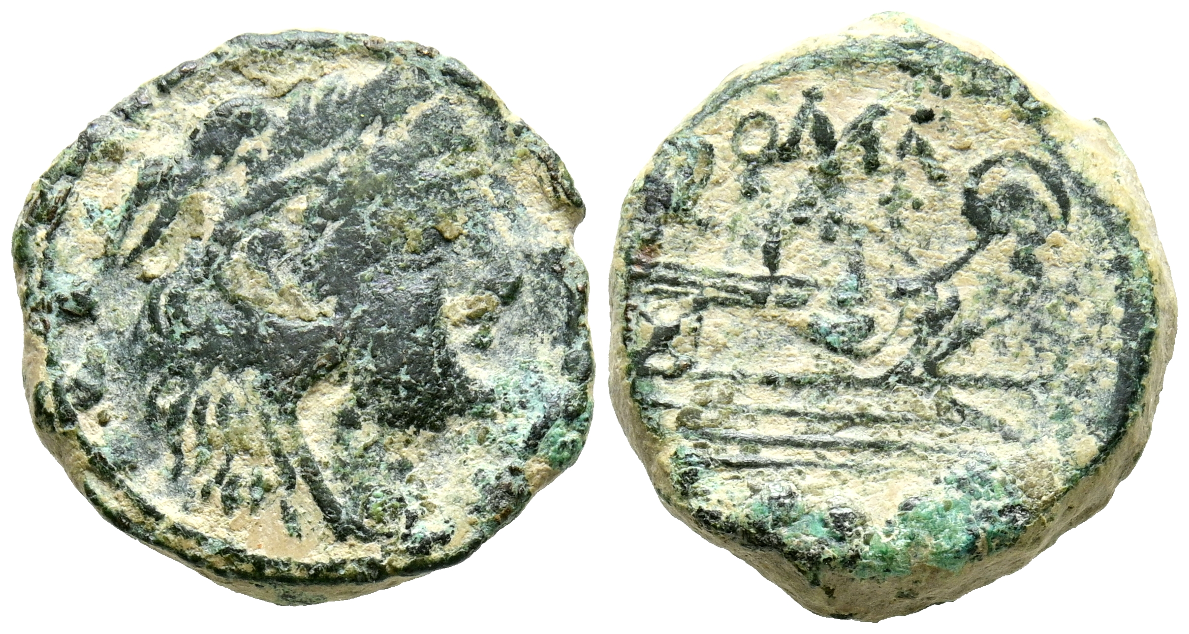 ACUÑACIONES ANONIMAS. Triente. (Ae. 4,41g/17mm). 211 a.C. Ceca incierta. (Crawford 56/4). Anv: Cabeza de Roma con casco a derecha, encima de cuatro puntos. Rev: Proa a derecha, encima: ROMA, debajo cuatro puntos. MBC-.