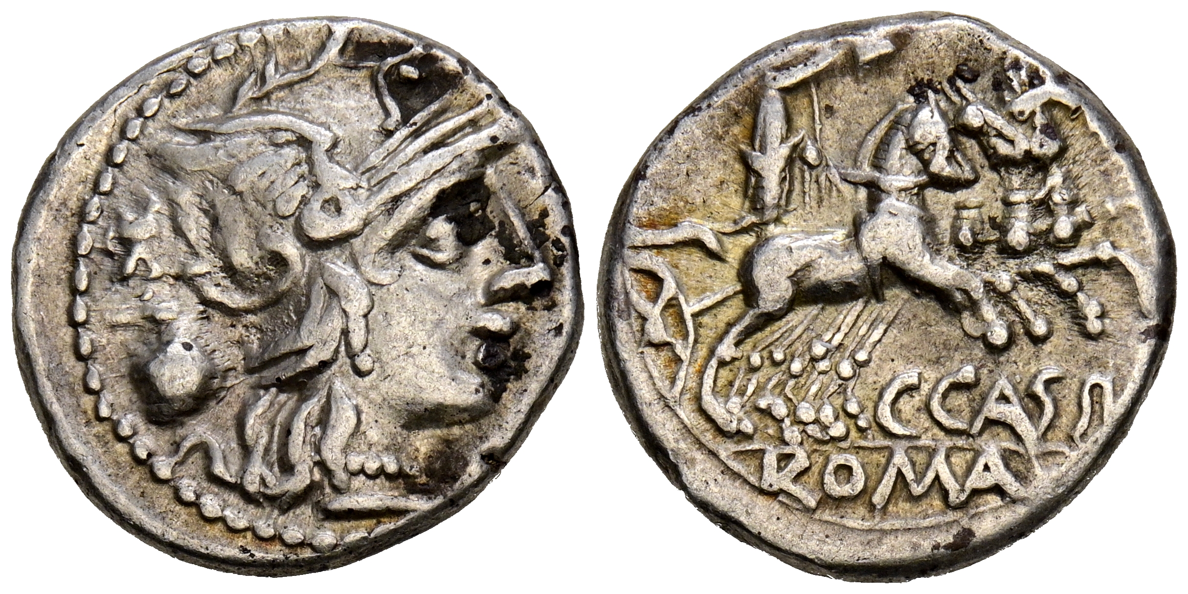 GENS CASSIA. Denario. (Ar. 3,88g/17mm). 126 a.C. Roma. (FFC 554; Crawford 226/1). Anv: Cabeza de Roma a derecha, delante estrella sobre urna. Rev: Libertad en cuádriga a derecha con cetro y gorro, debajo leyenda: C CASSI, en exergo: ROMA. MBC. Pequeños depósitos en anverso.