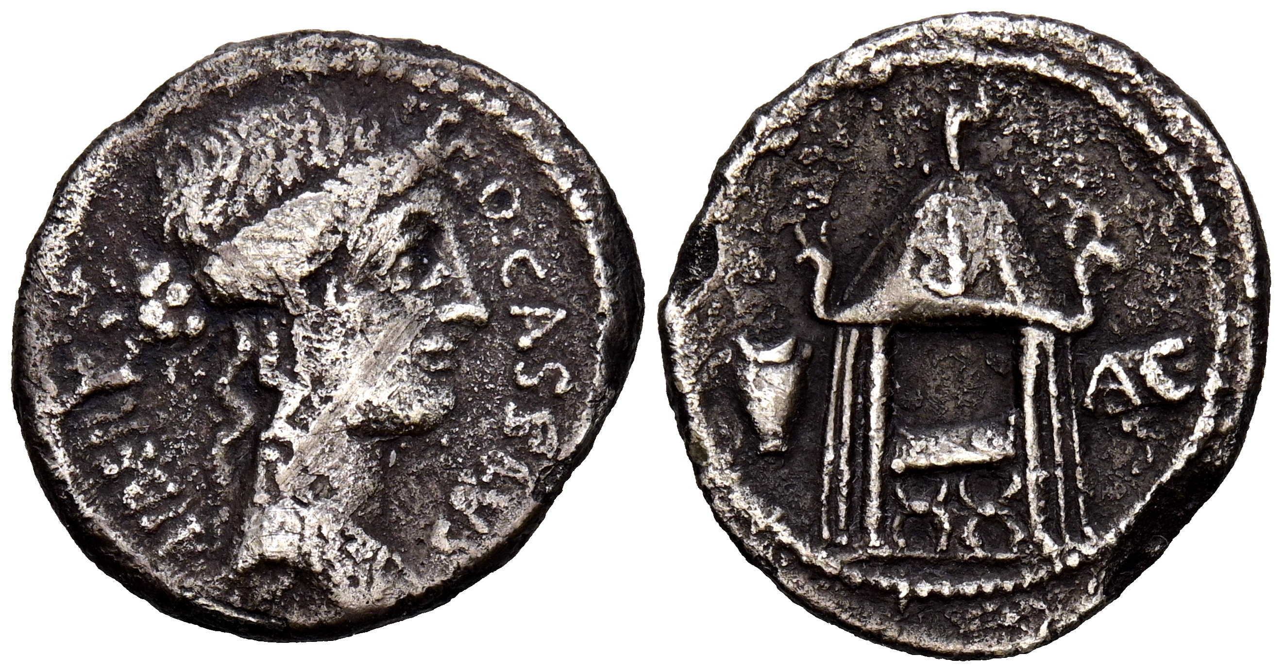 GENS CASSIA. Denario. (Ar. 3,45g/19mm). 55 a.C. Roma. (FFC 560; Crawford 428/2). Anv: Cabeza de Libertas a derecha, alrededor leyenda: Q CASSIVS LIBERT. Rev: Silla curul dentro de templo de Vesta con cúpula, encima figura estante portando cetro y patera, a la izquierda urna y a la derecha tablilla con inscripción: AC. MBC-.