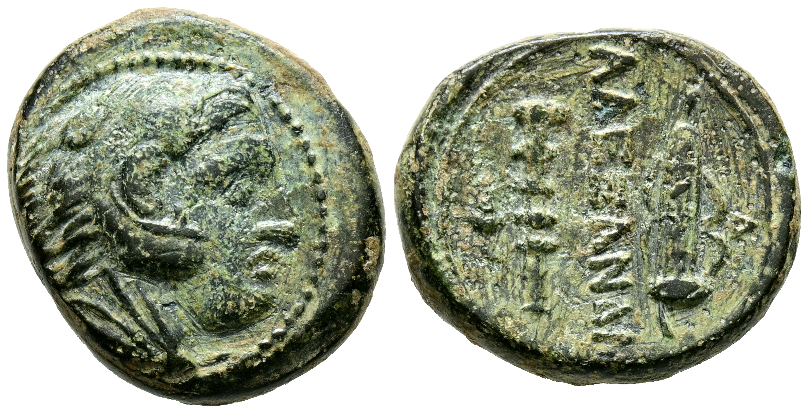REYES DE MACEDONIA, Alejandro III el Grande. Ae19. (Ae. 5,56g/19mm). 336-323 a.C. Ceca incierta. (Price 266; HGC 3.1, 925a). Anv: Cabeza de Hércules con piel de león a derecha. Rev: Leyenda griega: AΛΕΞΑΝΔΡOY, entre mazo y arco con carcaj. MBC.