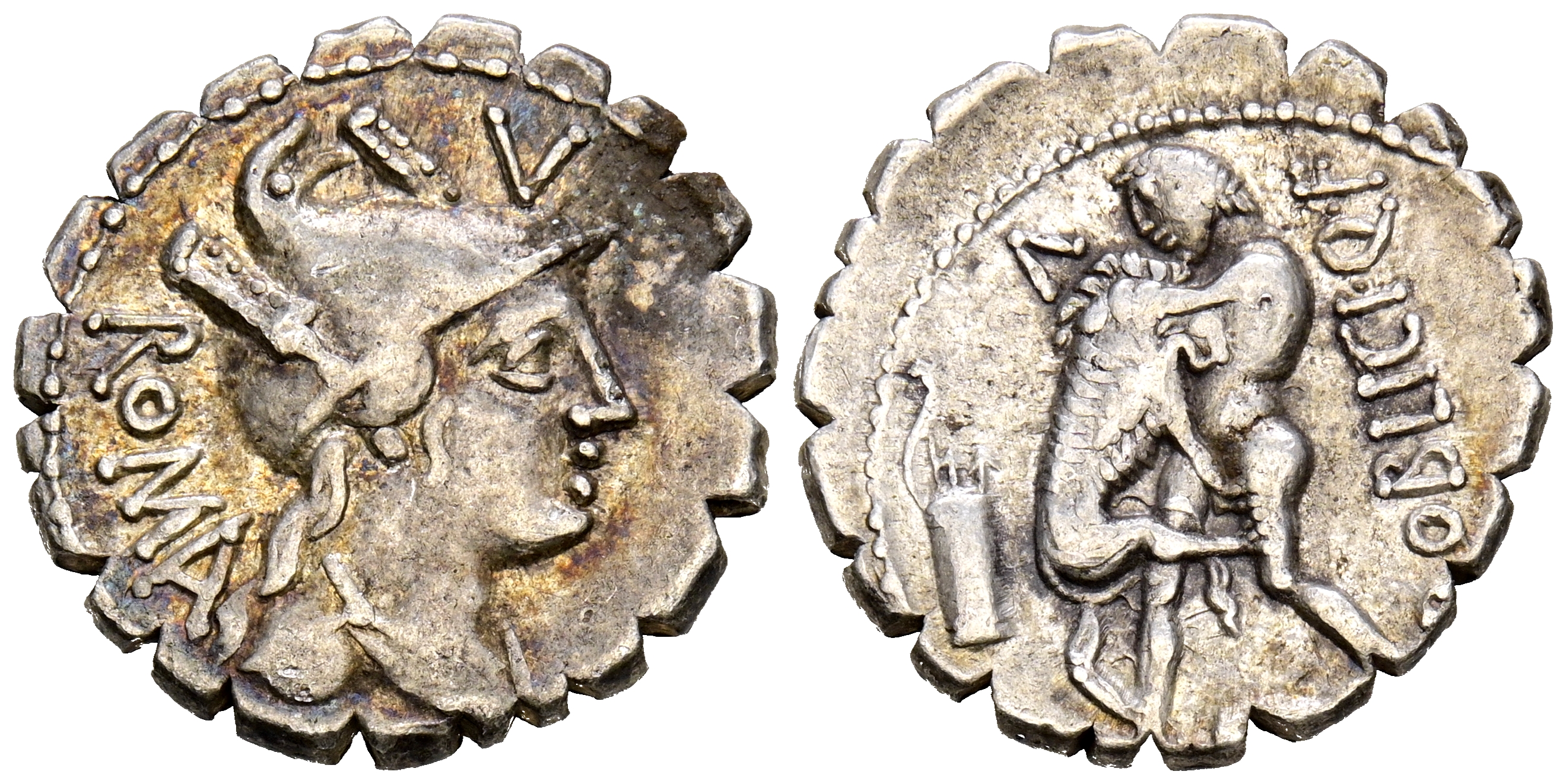 GENS POBLICIA. Denario. (Ar. 3,93g/19mm). 80 a.C. Taller auxiliar de Roma. (FFC 1017; Crawford 380/1). Anv: Cabeza de Roma a derecha, encima: V, detrás leyenda: ROMA. Rev: Hércules estante a izquierda estrangulando al león de Nemea, delante: mazo, arco y carcaj, encima: L, detrás leyenda: C POBLICI Q F. MBC.