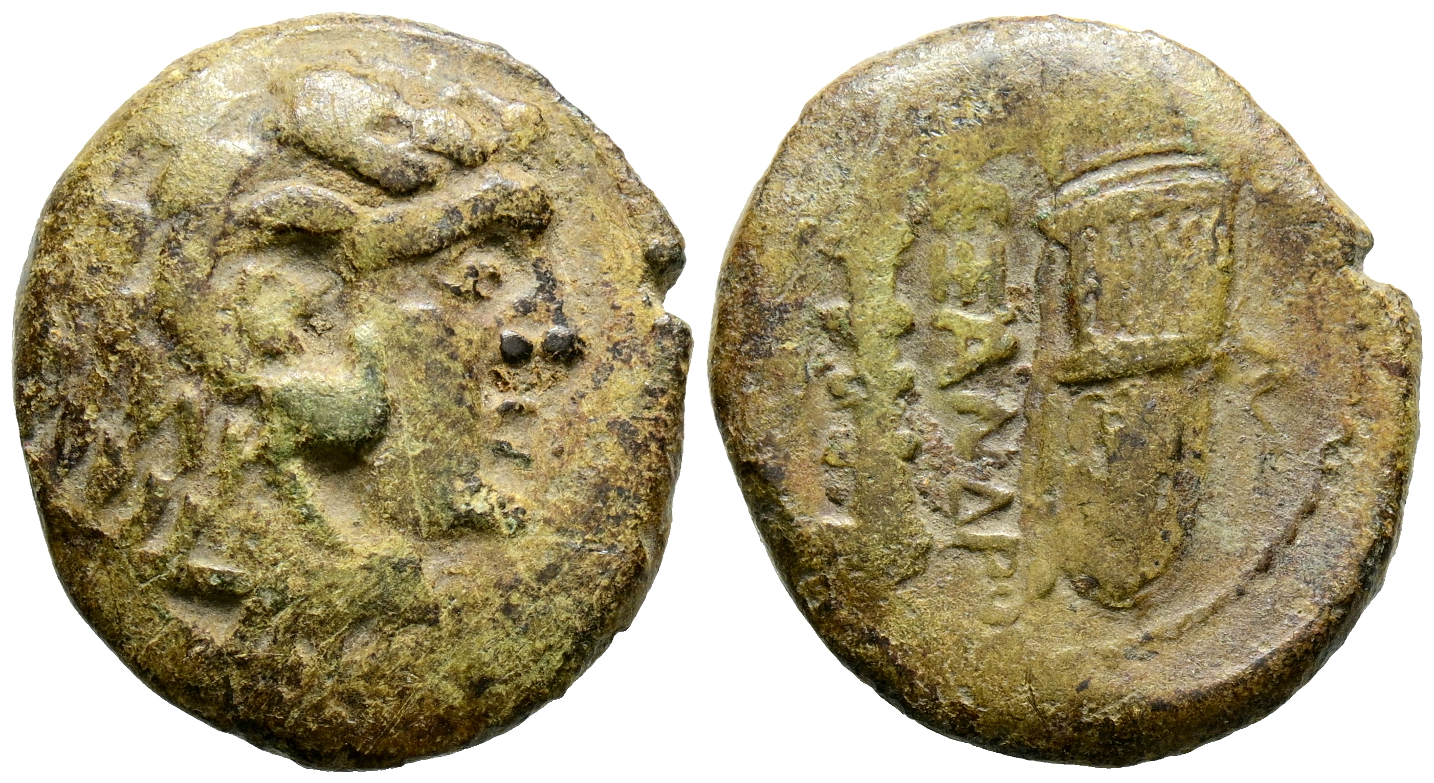 REYES DE MACEDONIA, Alejandro III el Grande. Ae21. (Ae. 6,02g/21mm). 336-323 a.C. Ceca incierta. (Price 266; HGC 3.1, 925a). Anv: Cabeza de Hércules con piel de león a derecha. Rev: Leyenda griega: AΛΕΞΑΝΔΡOY, entre mazo y arco con carcaj. MBC.