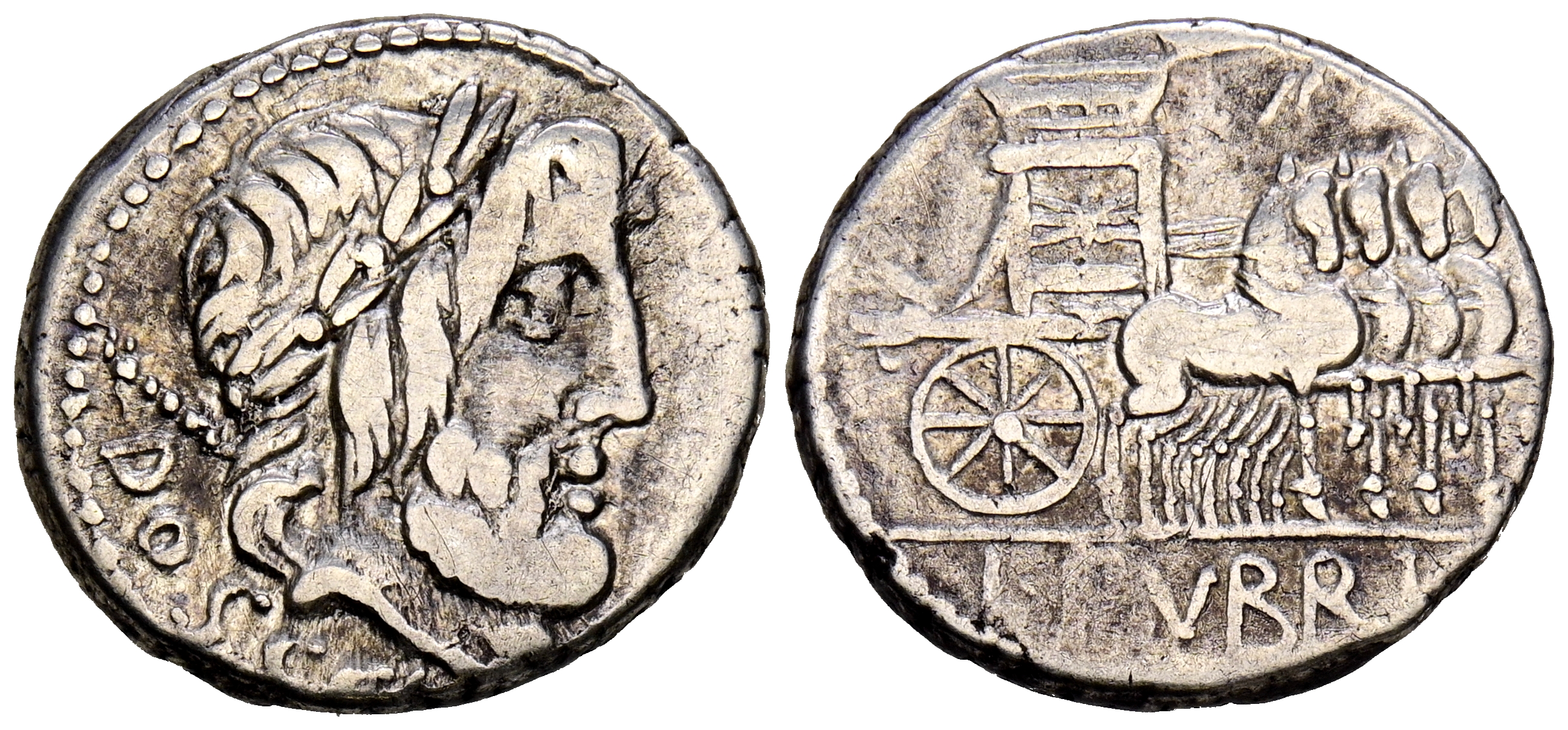 GENS RUBRIA. Denario. (Ar. 3,81g/18mm). 87 a.C. Roma. (FFC 1091; Crawford 348/1). Anv: Cabeza laureada de Júpiter a derecha, con cetro sobre hombro, detrás DOSSEN. Rev: Carro triunfal a derecha encima Victoria volando con una corona, en exergo: L RVBRI. MBC.