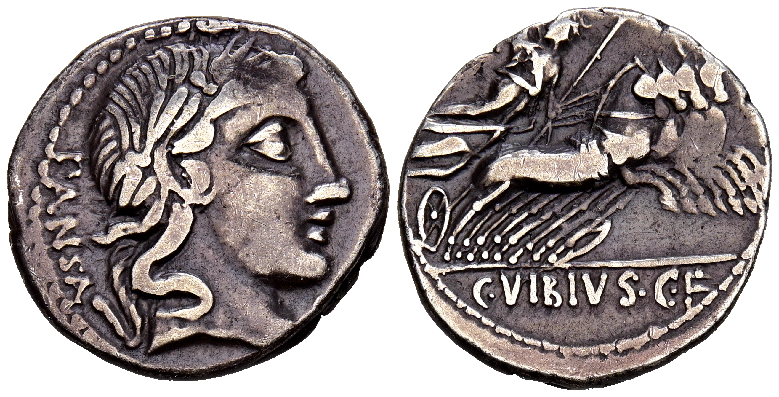 GENS VIBIA. Denario. (Ar. 3,73g/18mm). 90 a.C. Taller auxiliar de Roma. (FFC 1187; Crawford 342/5b). Anv: Cabeza laureada de Apolo a derecha, detrás leyenda: PANSA, delante símbolo. Rev: Minerva conduciendo cuádriga a derecha portando cetro y trofeo, debajo: C VIBIVS CF. MBC.