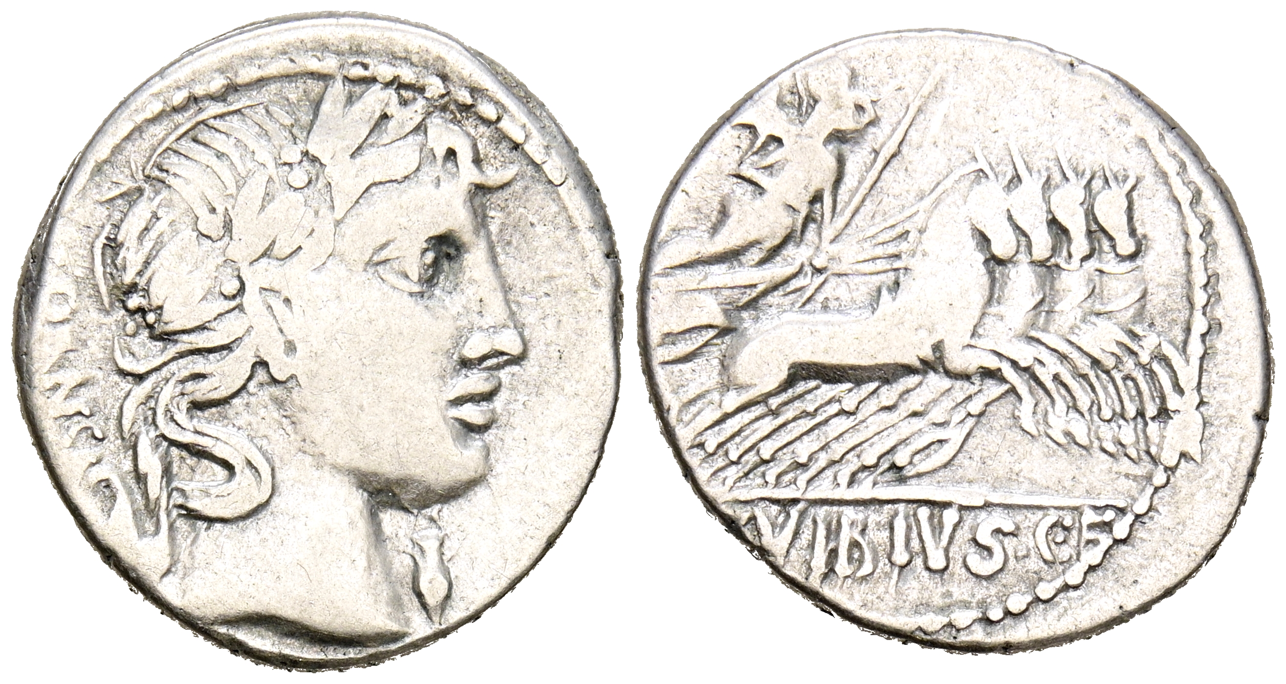 GENS VIBIA. Denario. (Ar. 3,83g/19mm). 90 a.C. Taller auxiliar de Roma. (FFC 1187; Crawford 342/5b). Anv: Cabeza laureada de Apolo a derecha, detrás leyenda: PANSA, bajo la barbilla: ánfora. Rev: Minerva conduciendo cuádriga a derecha portando cetro y trofeo, debajo: C VIBIVS CF. MBC.