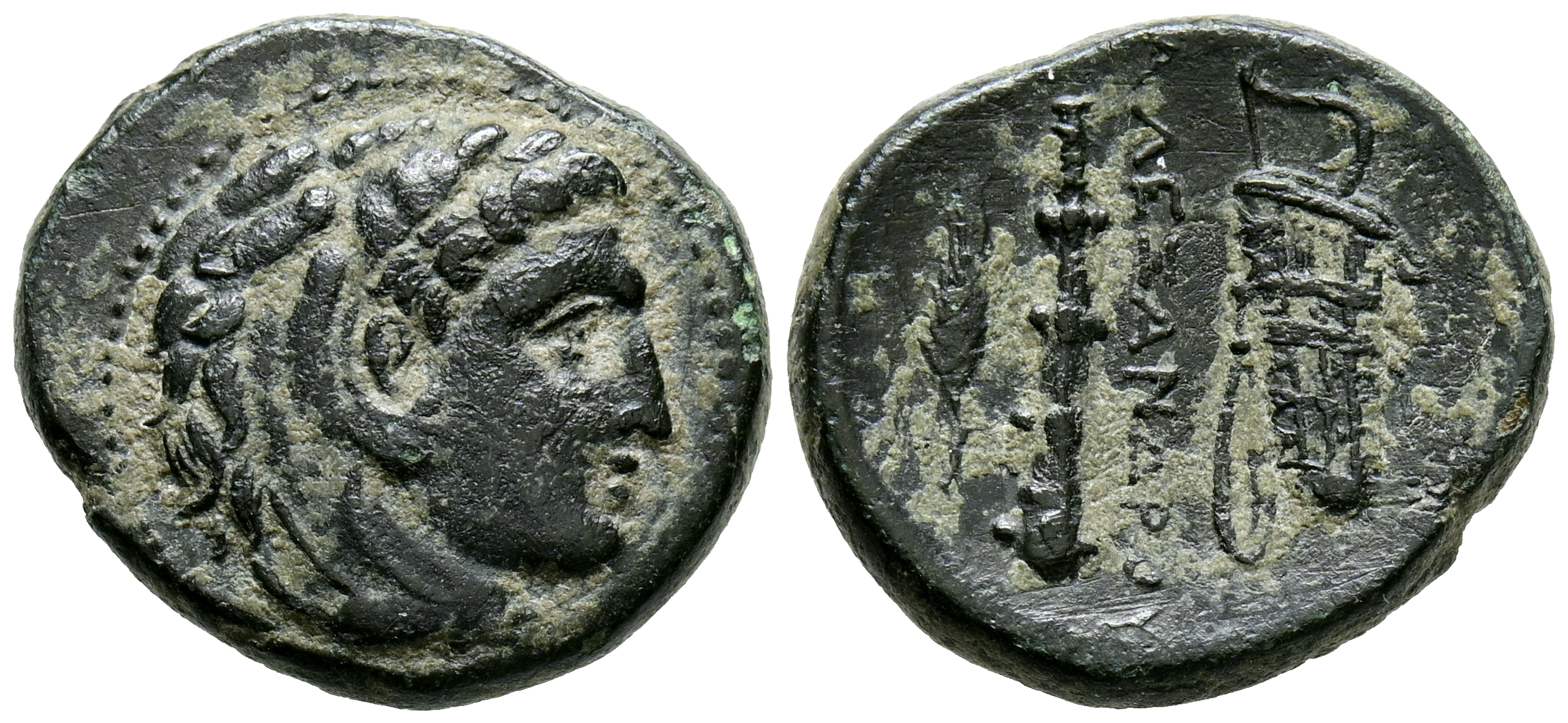 REYES DE MACEDONIA, Alejandro III el Grande. Ae18. (Ae. 5,49g/19mm). 336-323 a.C. Anv: Cabeza de Heracles con piel de león a derecha. Rev: Leyenda griega entre mazo y carcaj. MBC.