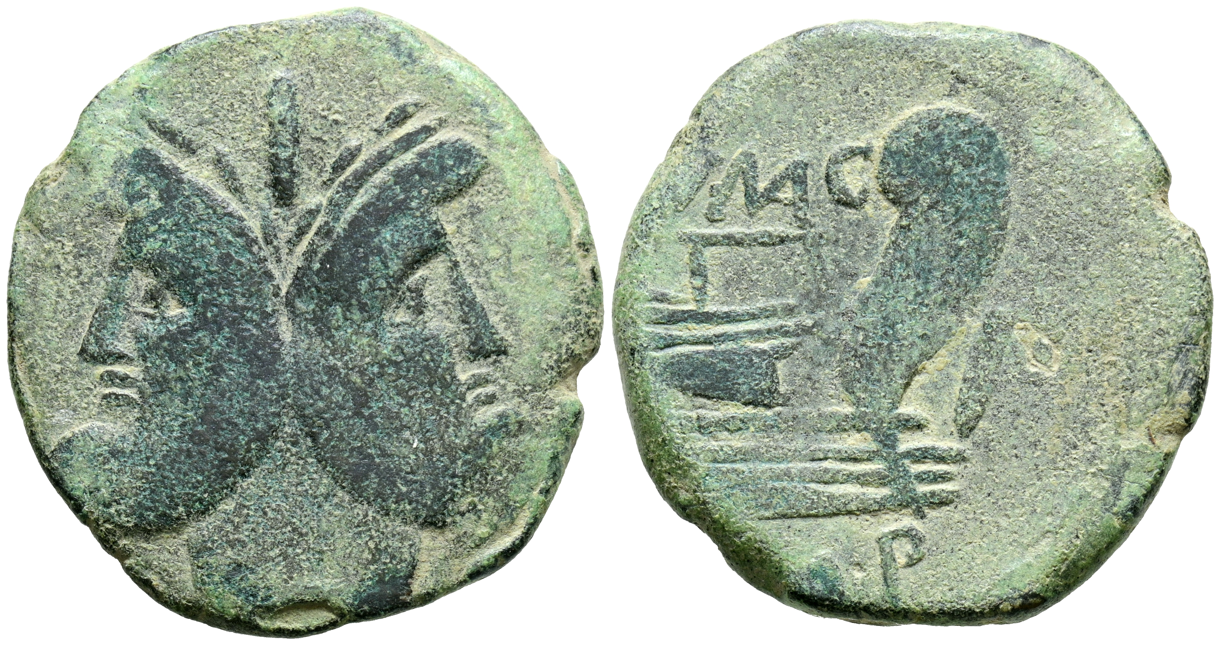 POMPEYO, el Grande. As. (Ae. 15,02g/31mm). 45 a.C. (Crawford 471/1). Anv: Cabeza de Jano bifronte, encima I. Rev: Proa a derecha, debajo leyenda: IMP, encima: CN MAG. MBC.