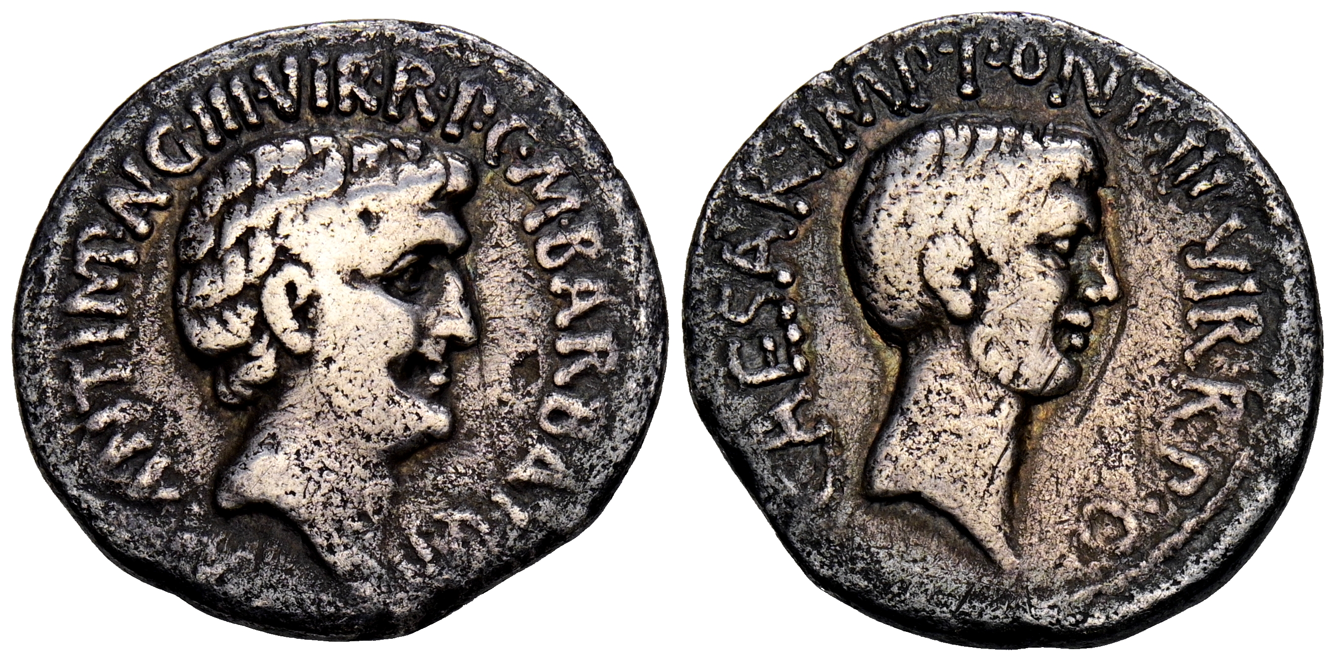 MARCO ANTONIO Y OCTAVIANO. Denario. (Ar. 3.53g/19mm). 41 a.C. Ceca incierta. (FFC 8; Crawford 517/2). Anv: Cabeza desnuda de Marco Antonio a derecha, alrededorleyenda: M ANTON IMP IIIVIR R P C AVG. Rev: Cabeza desnuda de Octavio a derecha, alrededor leyenda: CAESAR IMP PONT IIIVIR R P C. MBC. Atractivo tono. Muy rara.