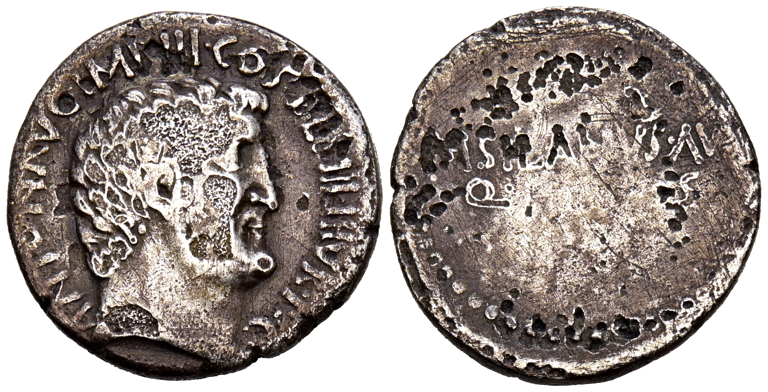 MARCO ANTONIO. Denario. (Ar. 3.22g/19mm). 83-30 a.C. Ceca Volante. (FFC-69; Crawford 542/1). Anv: Cabeza desnuda de Marco Antonio a derecha, alrededor leyenda: ANTON AVG IMP III COS DES III IIIV R P C. Rev: M SILANVS AVG / Q PRO COS. BC+. Plata mal batida. Rara.