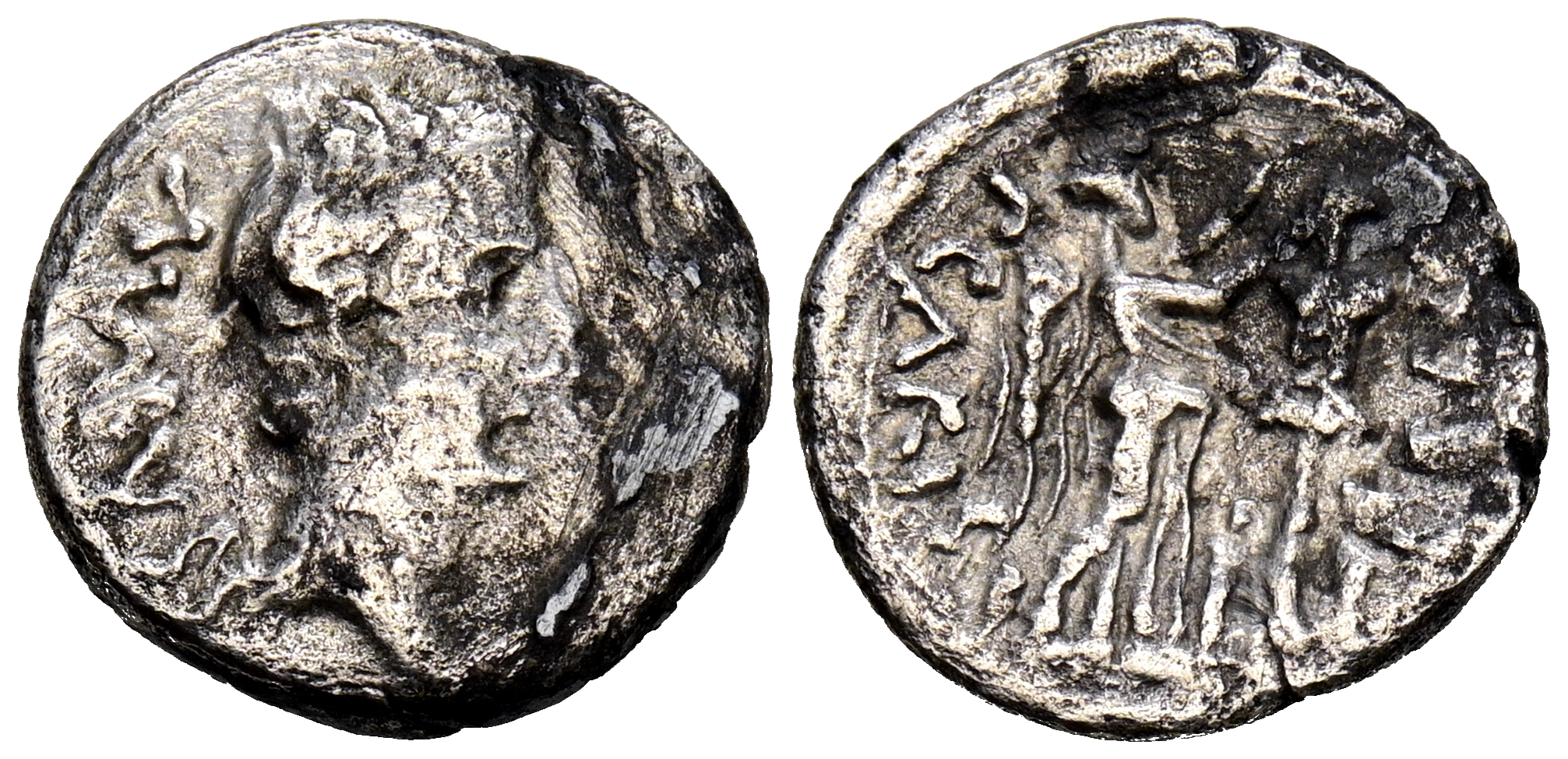 AUGUSTO. Quinario. (Ar. 1,50g/14mm). 25-23 a.C. Emérita Augusta. (RIC 1a). Anv: Cabeza de Augusto a derecha, detrás leyenda: AVGVSTVS. Rev: Victoria estante a derecha coronando trofeo, alrededor leyenda: P CARISI LEG. MBC-.