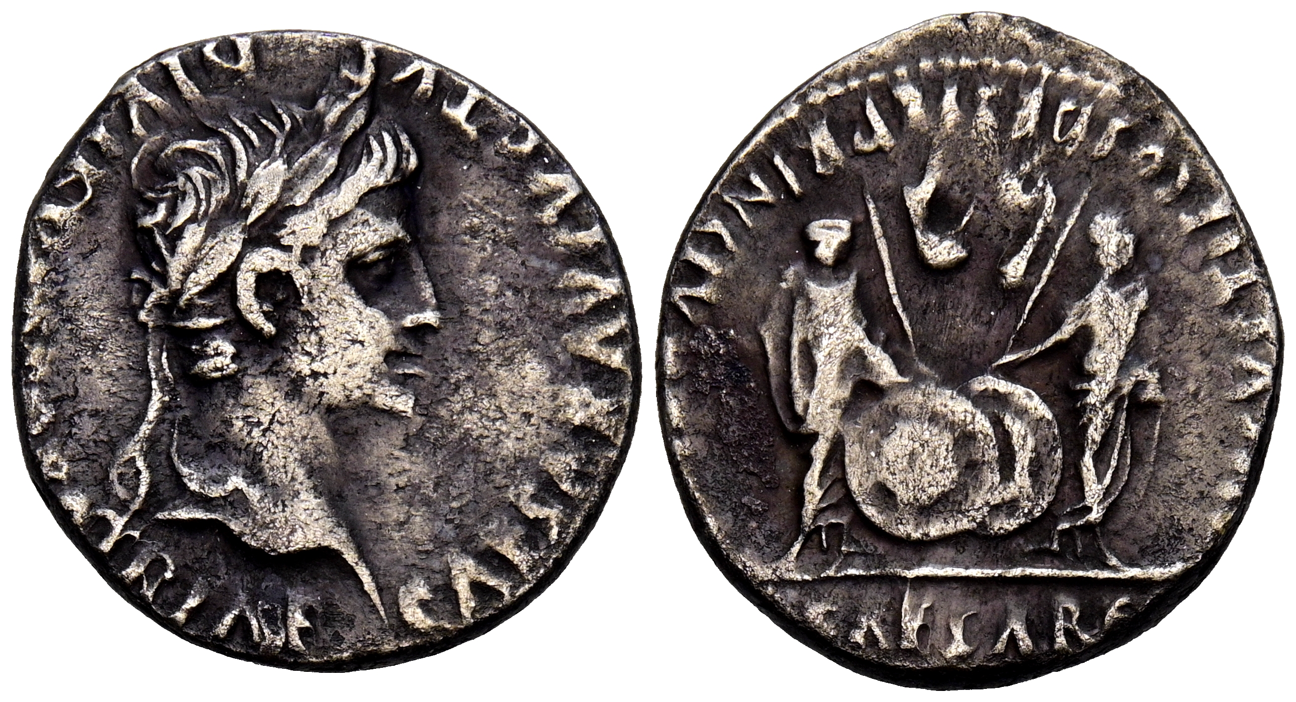 AUGUSTO. Denario. (Ar. 3,54g/19mm). 7-6 a.C. (RIC 207). Anv: Cabeza laureada de Augusto a derecha, alrededor leyenda: CAESAR AVGVSTVS DIVI F PATER PATRIAE. Rev: Cayo y Lucio estantes de frente, entre ellos escudo y lanzas, en campo símpulo y lítuo, en exergo: CL CAESARES, alrededor leyenda: AVGVSTI F COS DESIG PRINC IVVENT. MBC-.