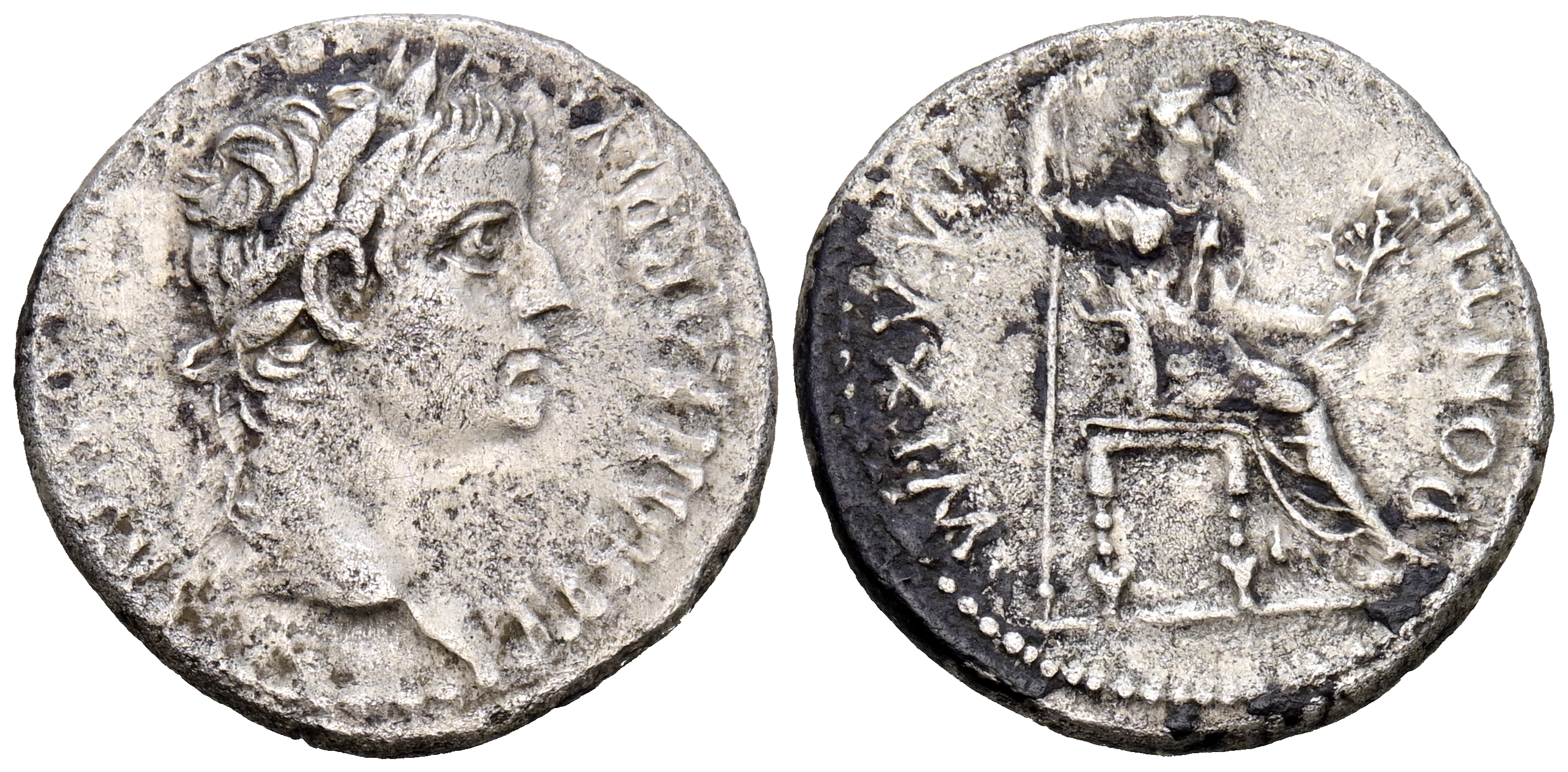 TIBERIO. Denario. (Ar. 3,55g/19mm). 14-37 d.C. Lugdunum. (RIC 30). Anv: Cabeza laureada de Tiberio a derecha portando cetro, alrededor leyenda: TI CAESAR DIVI AVGVSTVS. Rev: Livia sentada a derecha, alrededor leyenda: MAXIM PONTIF. MBC. Limpiado.