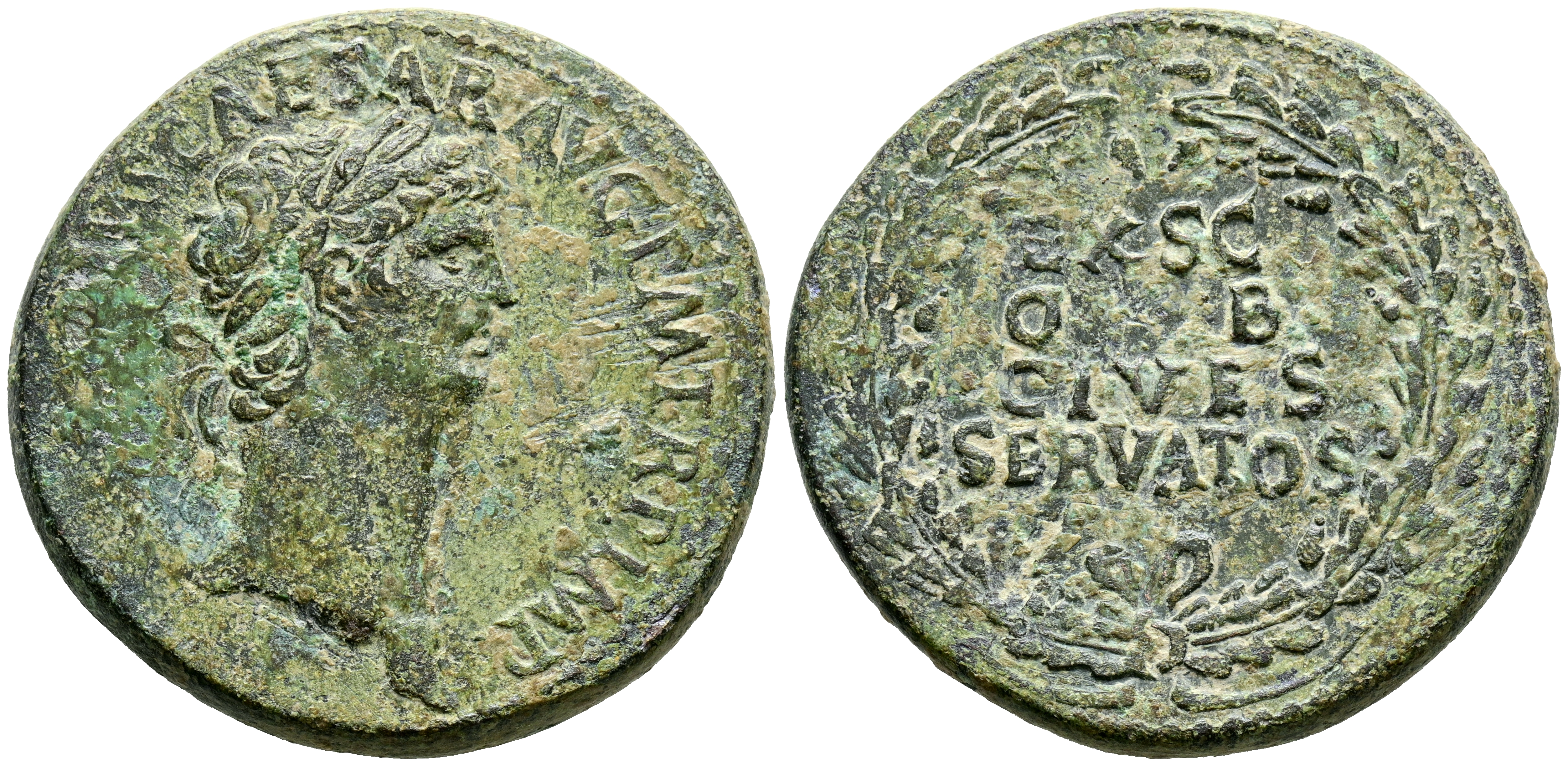 CLAUDIO I. Sestercio. (Ae. 25,55g/35mm). 41-54 d.C. Roma. (RIC 96). Anv: Cabeza laureada de Claudio I a derecha, alrededor leyenda: TI CLAVDIVS CAESAR AVG P M TR P IMP. Rev: Leyenda. EX SC/OB/CIVES/SERVATOS, dentro de corona de laurel. MBC. Raro ejemplar.
