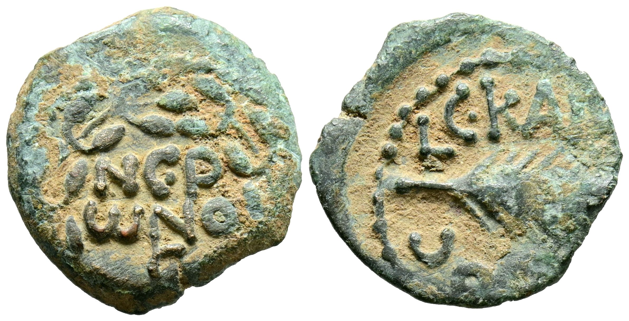 JUDAEA (Provincia Romana). Prutah (Ae. 1,89g/16mm). 59-62 d.C. Porcio Festo, Procurador de Judea bajo gobierno de Nerón. (RPC 4972). Anv: Leyenda: CE NEP WNO C dentro de corona, debajo X. Rev: rama de palma con leyenda LE KAICAPOC. MBC.