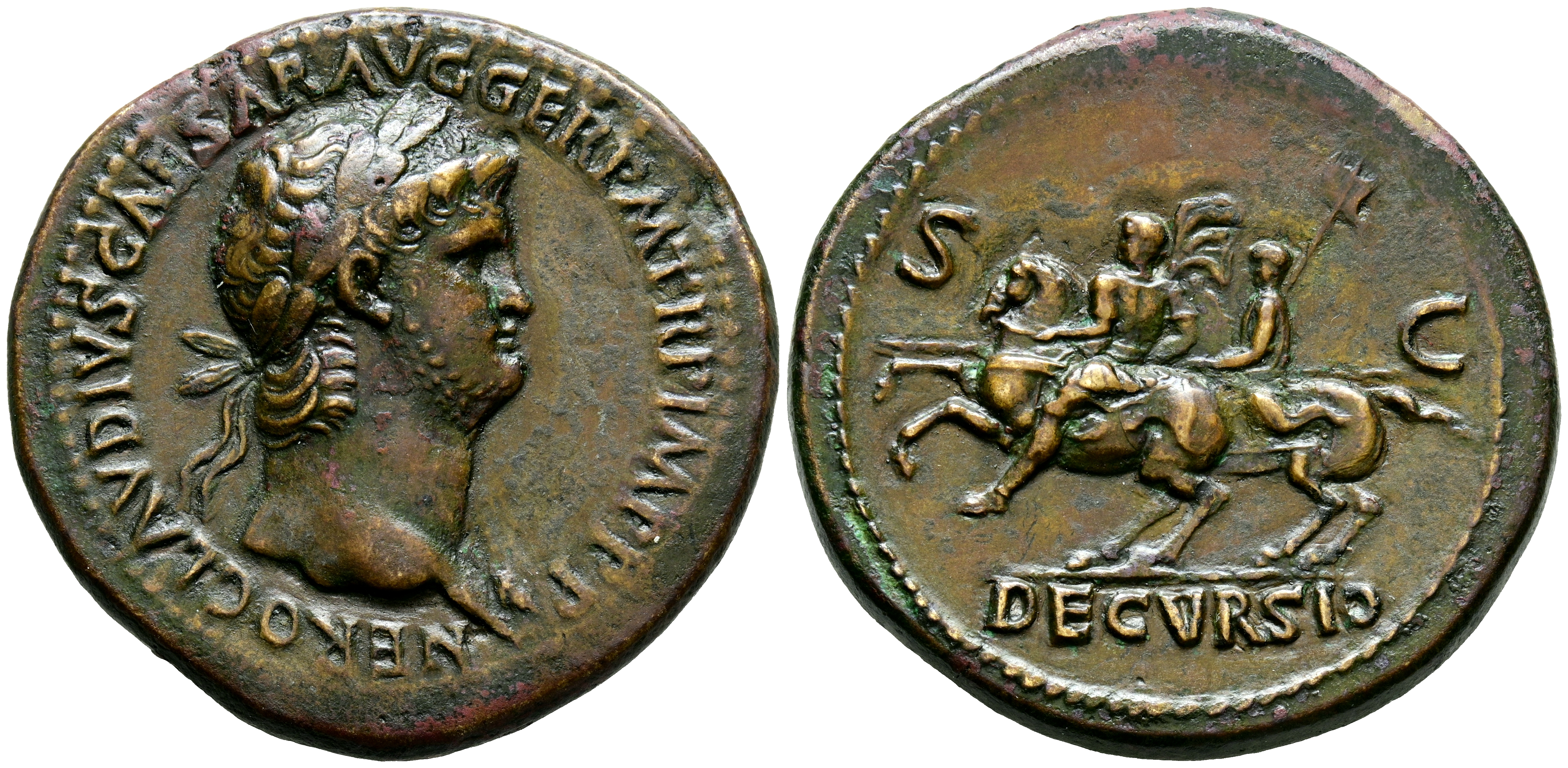 NERÓN. Sestercio Paduano. (Ae. 25,31g/37mm). Siglo XVII-XVIII. Roma. Anv: Busto laureado de Nerón a derecha, alrededor leyenda: NERO CLAVD CAESAR AVG GER P M TR P IMP P P. Rev: Nerón con atuendo militar portando lanza sobre caballo, a su lado un soldado a caballo, ambos a derecha, entre S-C, en exergo DECVRSIO. MBC+.