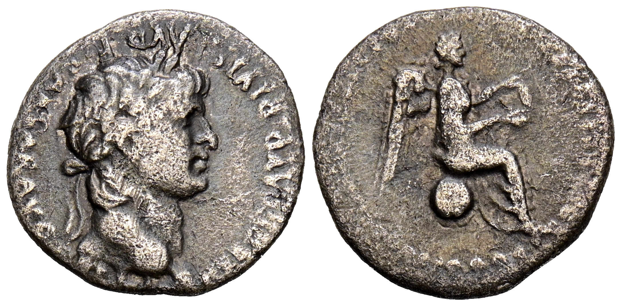 NERON. Quinario. (Ar. 1,72g/14mm). 54-68 d.C. Capadocia, Caesarea. (RPC 3645). Anv: Cabeza laureada de Nerón a derecha, alrededor leyenda: NERO CLAVD DIVI CLAVD F CAESAR AVG GERMANI. Rev: Victoria sentada sobre globo a derecha portando corona de laurel. MBC-.