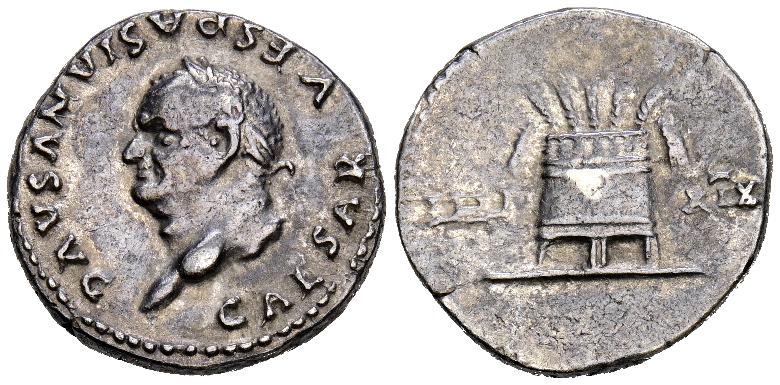 VESPASIANO. Denario. (Ar. 3,53g/17mm). 77-78 d.C. Roma. (RIC 981). Anv: Cabeza laureada de Vespasiano a izquierda, alrededor leyenda: CAESAR VESPASIANVS AVG. Rev: Modio, entre: IMP-XIX. MBC.