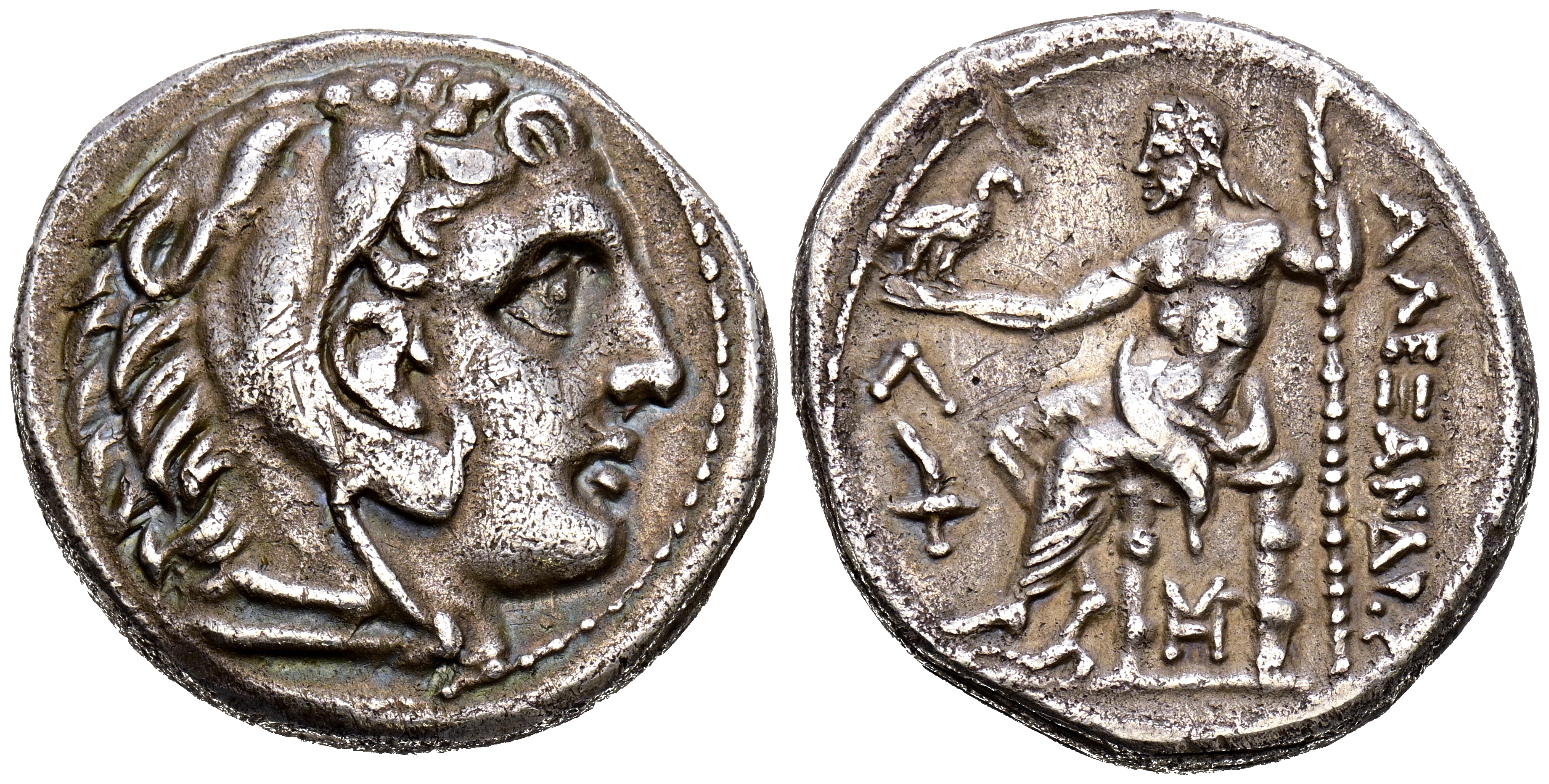 REYES DE MACEDONIA, Alejandro III el Grande. Tetradracma. (Ar. 16,95g/26mm). 311-300 a.C. Anfípolis. (Price 452). Anv: Cabeza de Heracles con piel de león a la derecha. Rev: Zeus sentado a la izquierda sosteniendo un cetro y un águila, delante Λ sobr e antorcha, bajo el trono monograma. MBC.