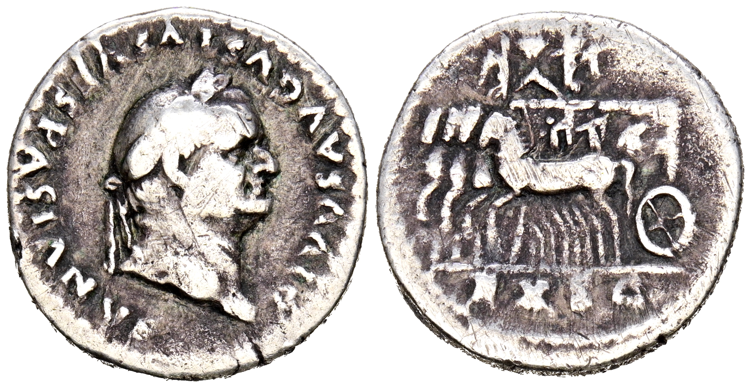 DIVO VESPASIANO. Denario. (Ar. 2,90g/18mm). 80-81 d.C. Roma. (RIC 361). Anv: Cabeza laureada de Vespasiano a derecha, alrededor leyenda: DIVVS AVGVSTVS VESPASIANVS. Rev: Cuádriga a izquierda tirando de un carro decorado con la figura de minerva portando lanza, encima cuádriga entre dos Victorias con palmas, en exergo: EX SC. MBC-.