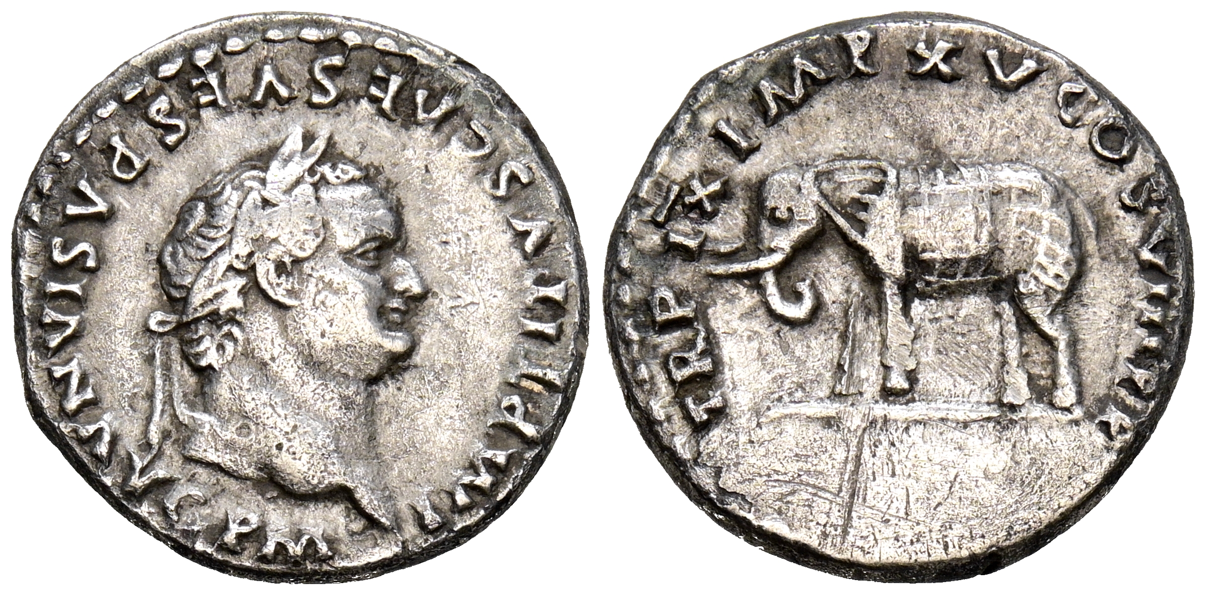 TITO. Denario. (Ar. 3,37g/17mm). 80 d.C. Roma. (RIC 115). Anv: Cabeza laureada de Tito a derecha, alrededor leyenda: IMP TITVS CAES VESPASIAN AVG P M. Rev: Elefante a izquierda, alrededor leyenda: TR P IX IMP XV COS VIII P P. MBC. Limpiado.
