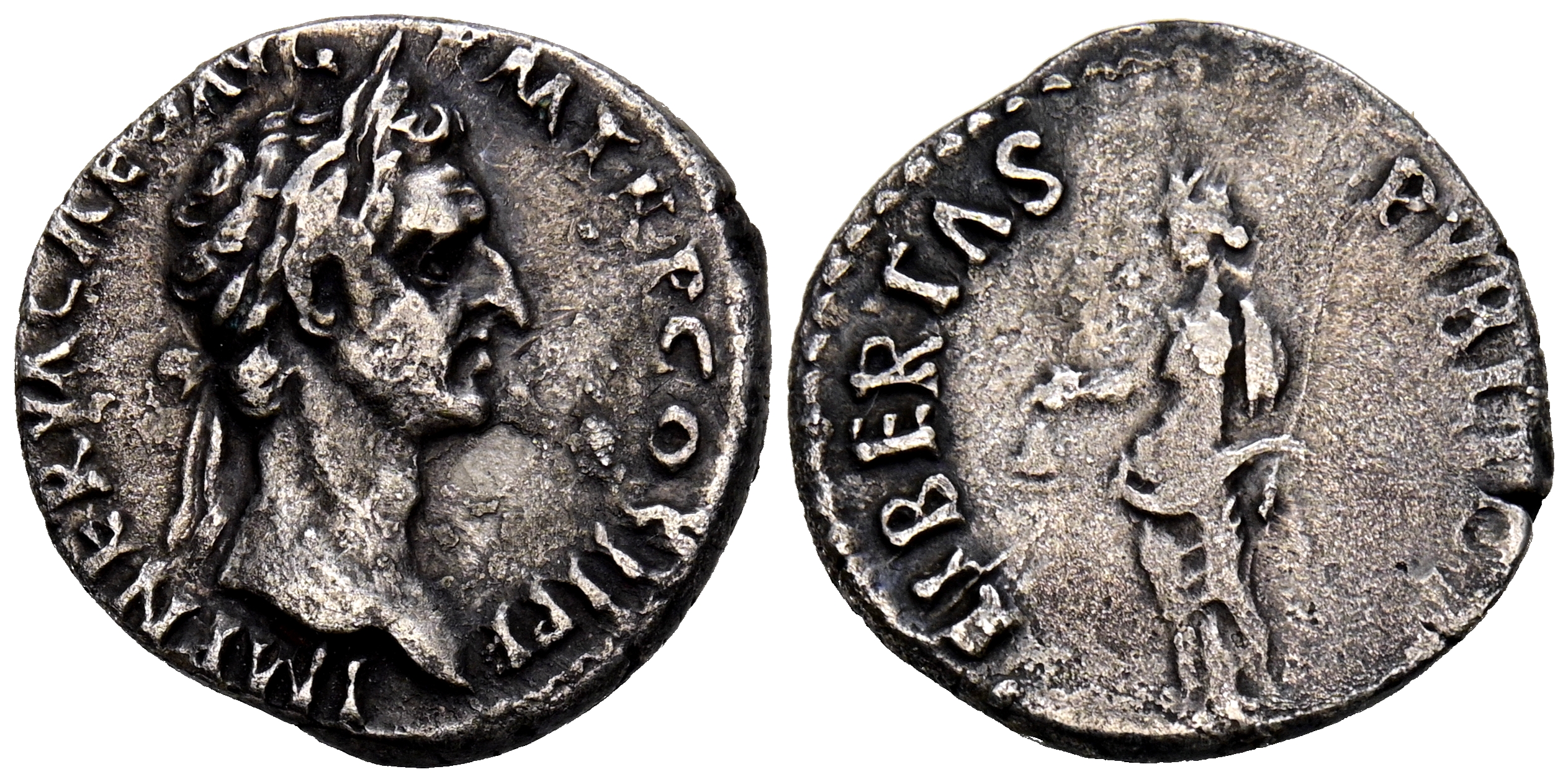 NERVA. Denario. (Ar. 3,24g/17mm). 96 d.C. Roma. (RIC 31). Anv: Cabeza de Nerva laureada a derecha, alrededor leyenda: IMP NERVA CAES AVG P M TR P COS III P P. Rev: Libertas estante a izquierda portando píleo y cetro, alrededor leyenda: LIBERTAS PVBLICA. MBC. Depósitos.