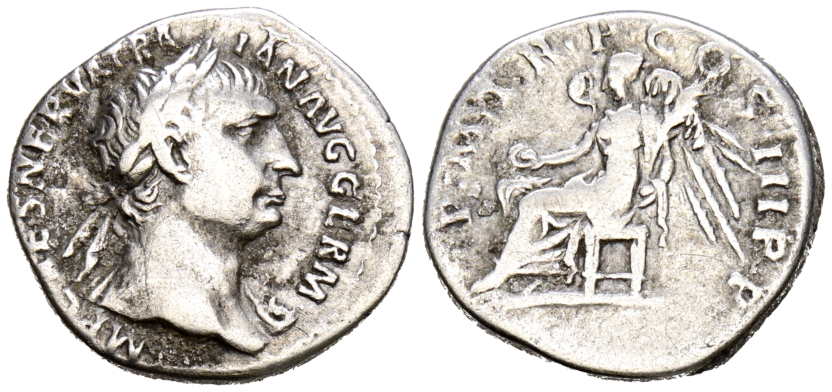 TRAJANO. Denario. (Ar. 3,25g/18mm). 101-102 d.C. Roma. (RIC 57). Obv: Busto laureado de Trajano derecho con drapeado sobre el hombro izquierdo, alrededor de la leyenda: IMP CAES NERVA TRAIAN AVG GERM. Rev: Victoria sentada a la izquierda con corona de laurel y palma, alrededor de la leyenda: PM TR P COS III P P. MBC/MBC-.