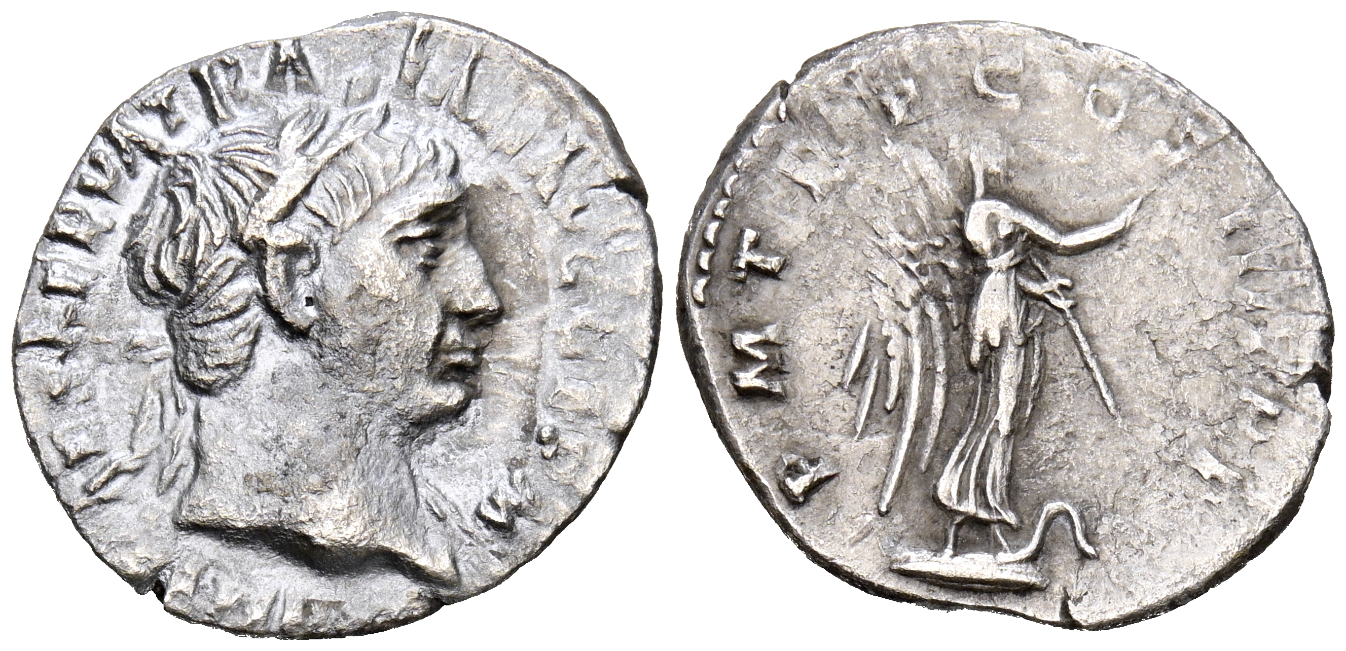 TRAJANO. Denario. (Ar. 2,66g/19mm). 102 d.C. Roma. (RIC 59). Anv: Cabeza laureada de Trajano a derecha, alrededor leyenda: IMP CAES NERVA TRAIAN AVG GERM. Rev: Victoria avanzando a derecha portando corona de laurel, a sus pies serpiente, alrededor leyenda: P M TR P COS IIII P P. MBC-.