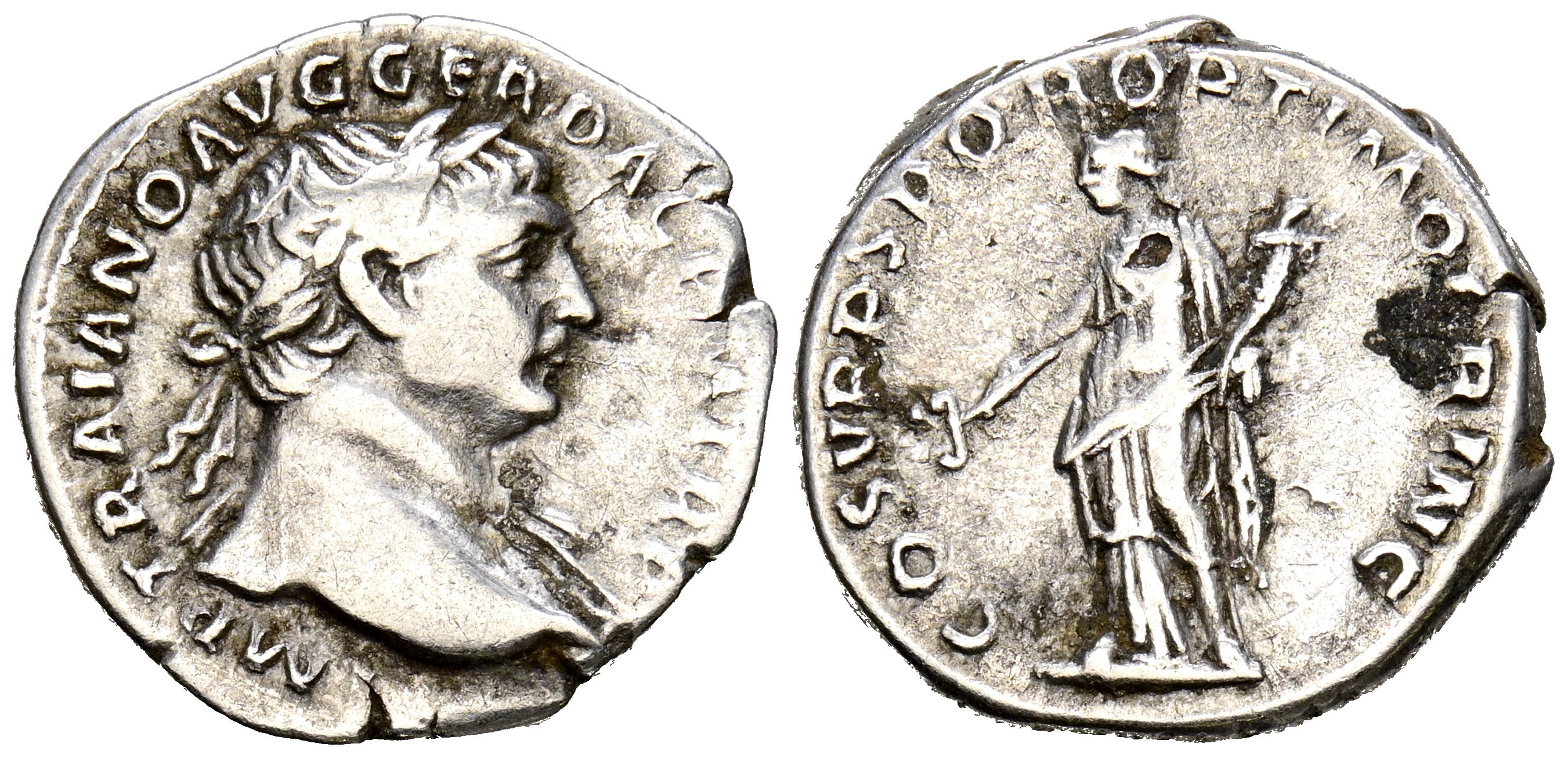 TRAJANO. Denario. (Ar. 3,33g/19mm). 103-111 d.C. Roma. (RIC 121). Anv: Cabeza laureada de Trajano a derecha con ligero drapeado en el hombro izquierdo, alrededor leyenda: IMP TRAIANO AVG GER DAC P M TR P. Rev: Felicitas estante a izquierda, portando caduceo y cornucopia, alrededor leyenda: COS V P P SPQR OPTIMO PRINC. MBC.