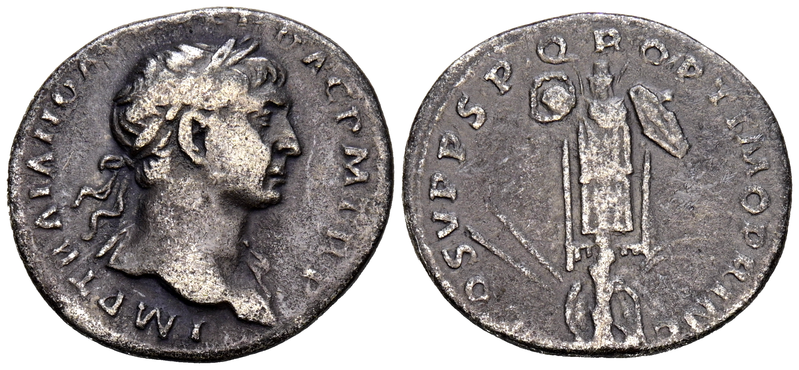 TRAJANO. Denario. 103-111 d.C. Roma. (RIC 147). Anv: Cabeza laureada de Trajano a derecha, alredor leyenda: IMP TRAIANO AVG GER DAC P M TR P. Rev: Trofeo, alrededor leyenda: COS V P P SPQR OPTIMO PRINC. MBC.