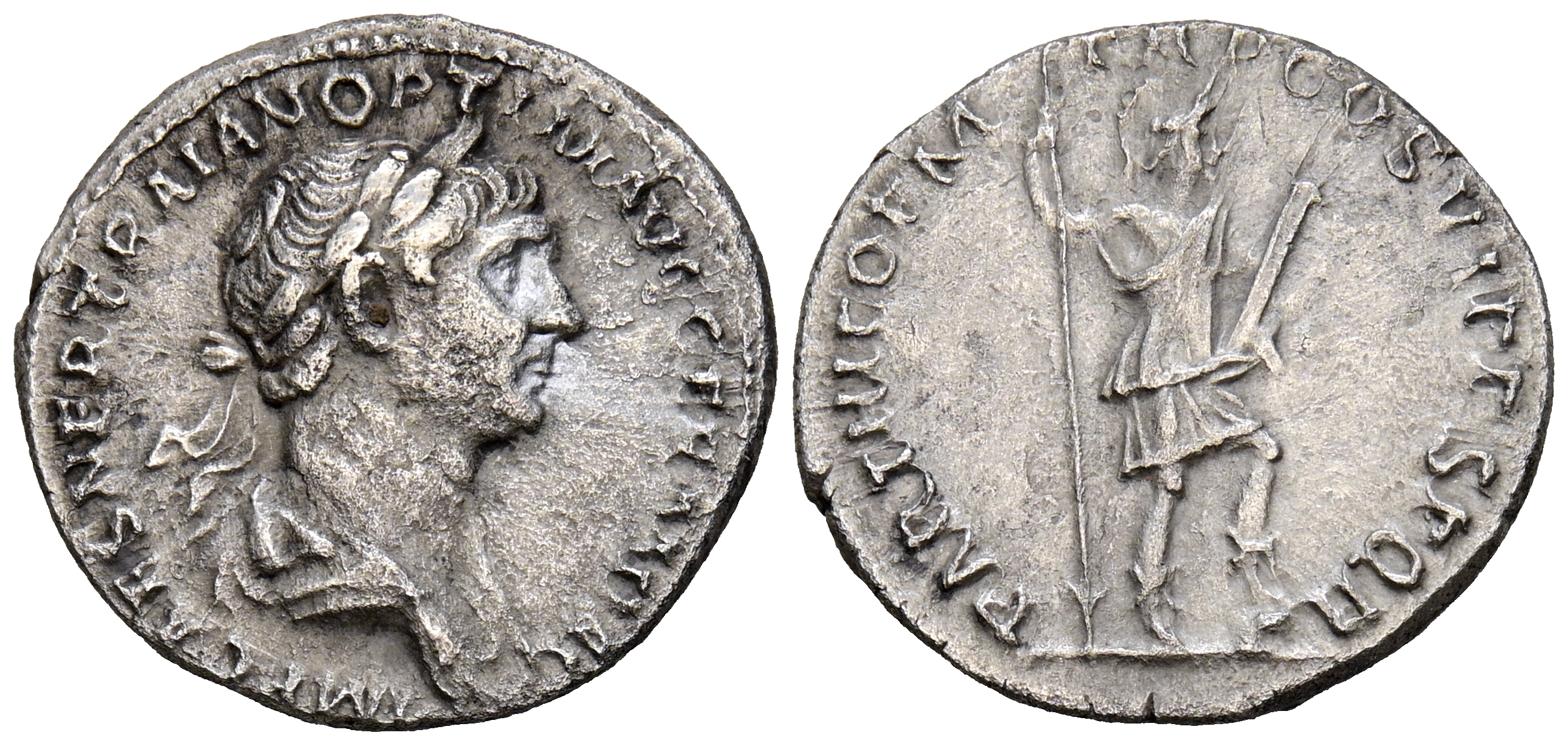 TRAJANO. Denario. (Ar. 3,03g/18mm). 116 d.C. Roma. (RIC 334). Anv: Busto laureado y drapeado de Trajano a derecha, alrededor leyenda: IMP CAES NER TRAIAN OPTIM AVG GER DAC. Rev: Virtus estante a derecha portando lanza y parazonium, pie izquierdo sobre casco, alrededor leyenda: PARTHICO P M TR P COS VI P P SPQR. MBC-.