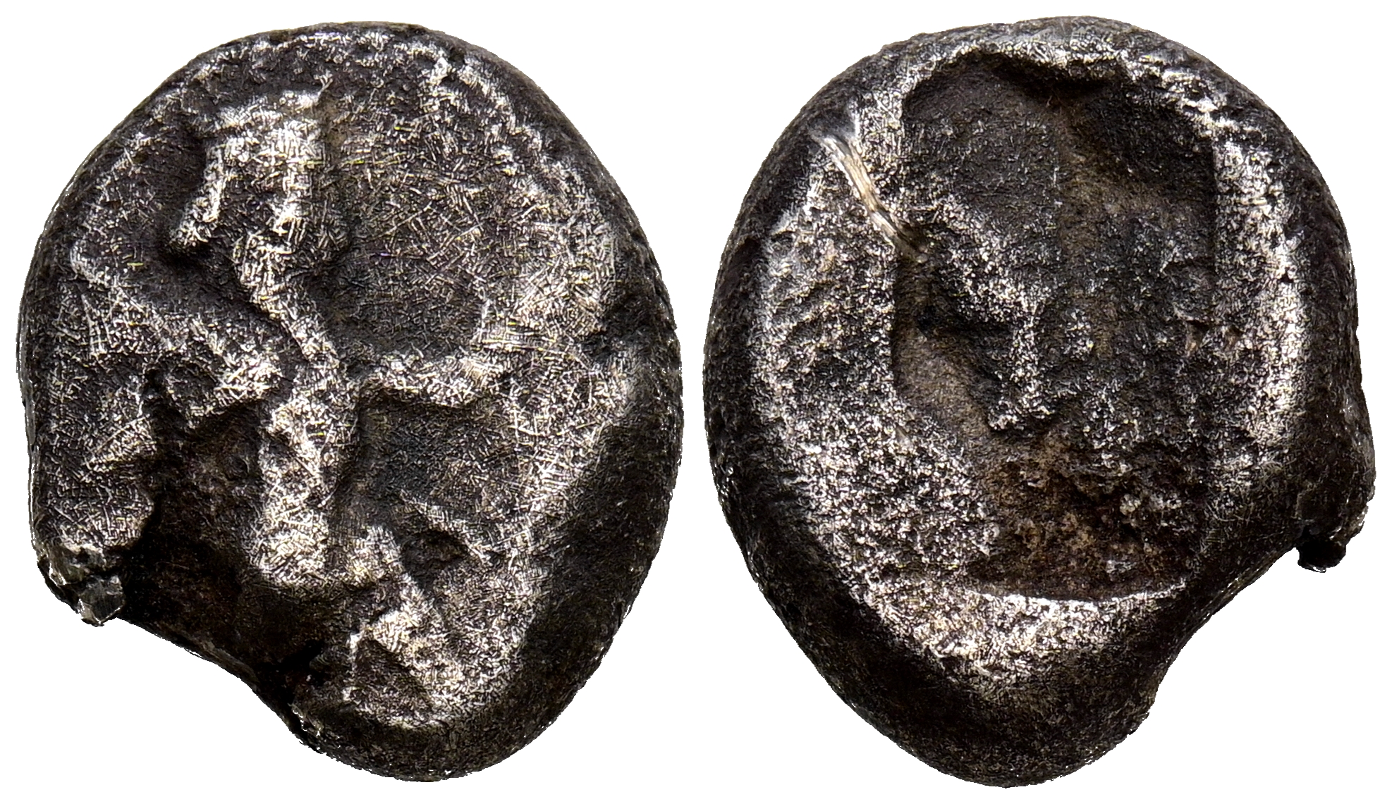 IMPERIO AQUEMENIDA, Tiempo de Jerjes I a Daríos II. Siglos. (Ar. 5,12g/15mm). 485-420 a.C. Sardes. (Sunrise 25). Anv: Rey persa arrodillado a derecha portando arco y lanza y carcaj en su espalda. Rev: Cuadrado incuso. MBC-.