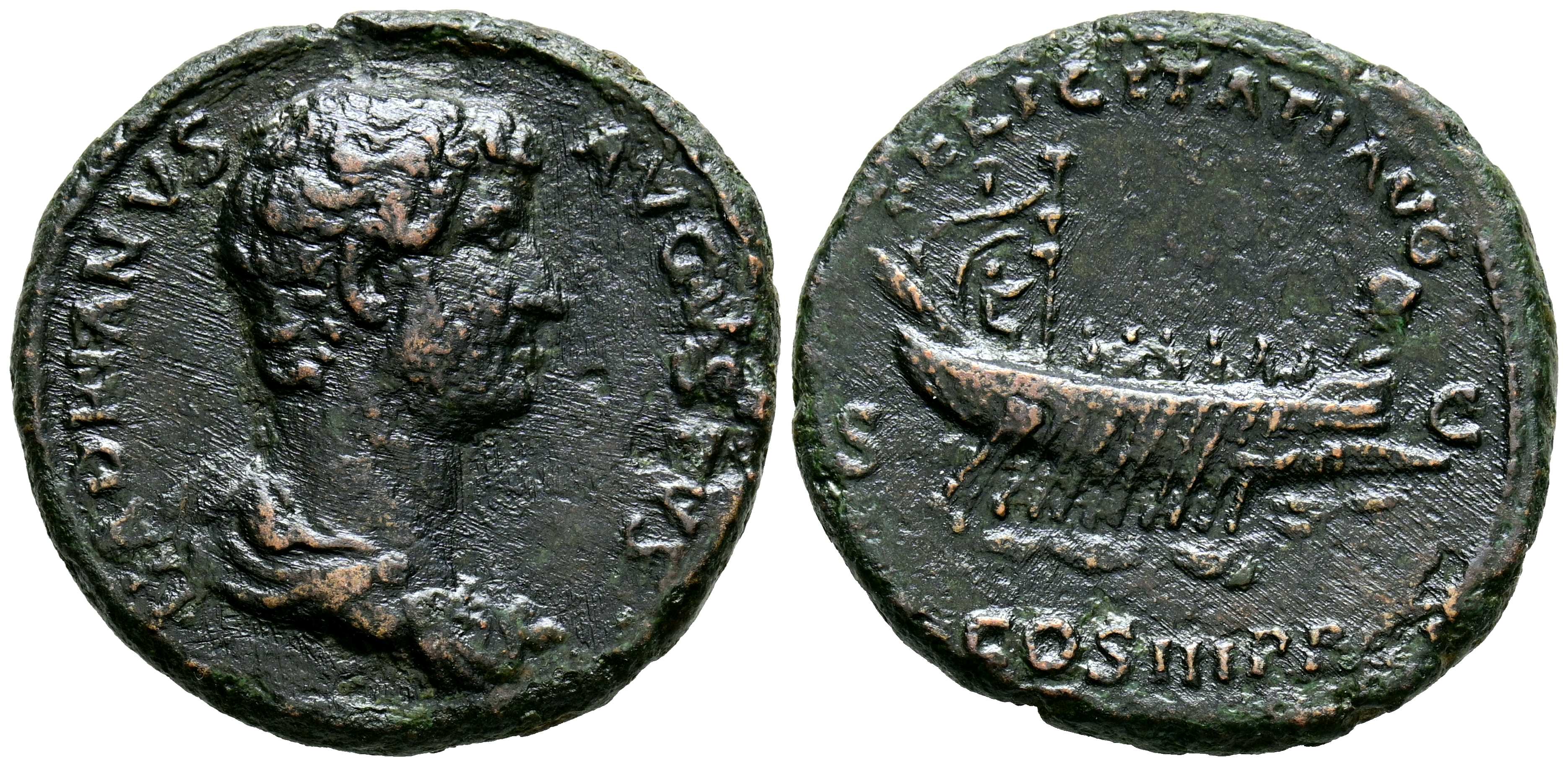 ADRIANO. As. (Ae. 10,16g/26mm). 132-134 d.C. Roma. (RIC 719). Anv: Busto drapeado de Adriano a la derecha, alrededor leyenda: HADRIANVS AVGVSTVS. Rev: Galera a derecha con remos y timonel y vexillum en proa, entre S-C, encima: FELICITATI AVG, debajo: COS III P P. MBC. Escasa.