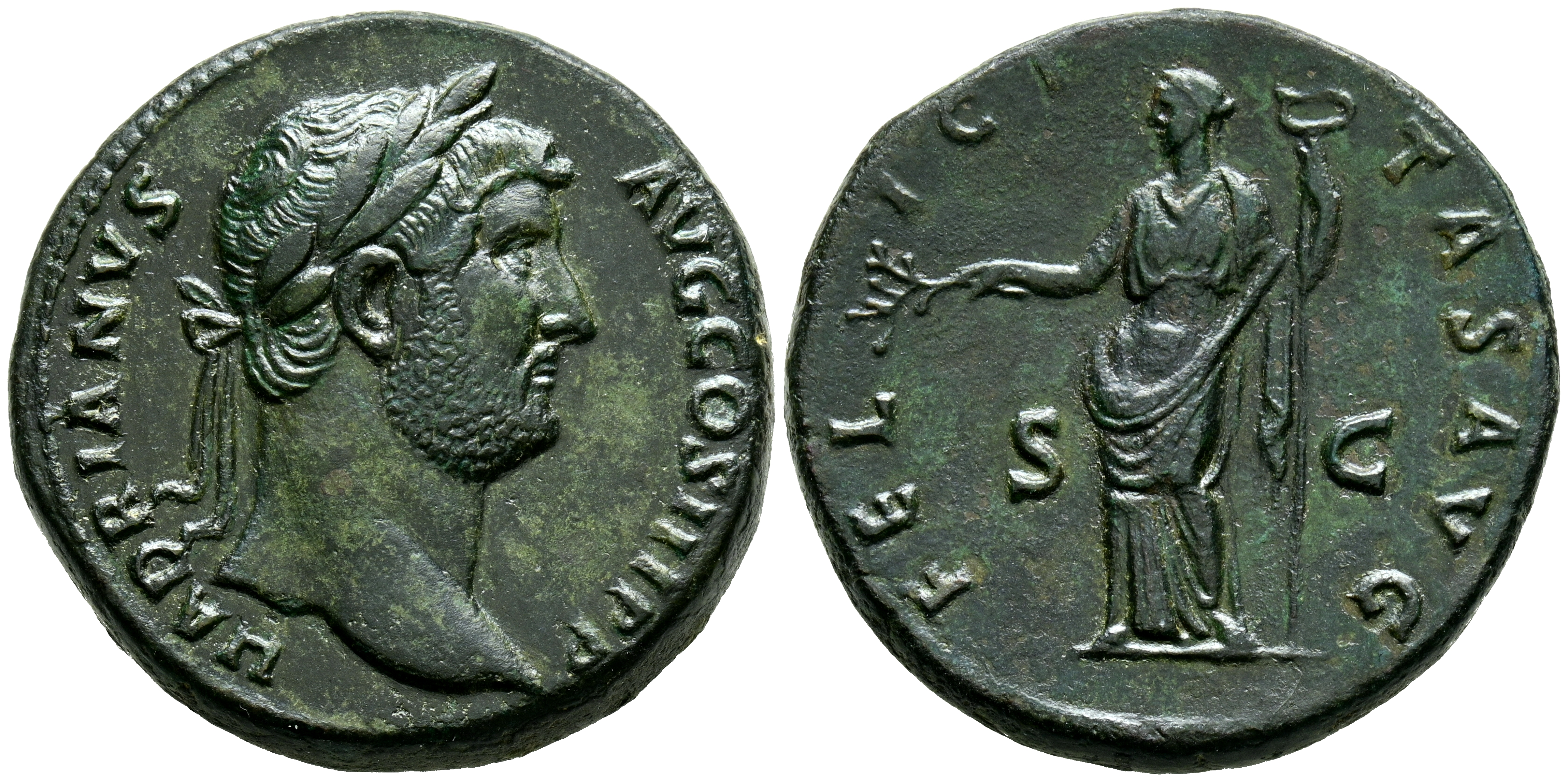 ADRIANO. Sestercio. (Ae. 26,13g/32mm). 136 D.C. Roma. (RIC 2255). Anv: Busto laureado de Adriano a derecha con drapeado en hombro izquierdo, alrededor leyenda: HADRIANVS AVG COS III P P. Rev: Felicitas estante a izquierda portando rama y caduceo, entre: S-C, alrededor leyenda: FELICITAS AVG. MBC+. Repasada y repatinada.