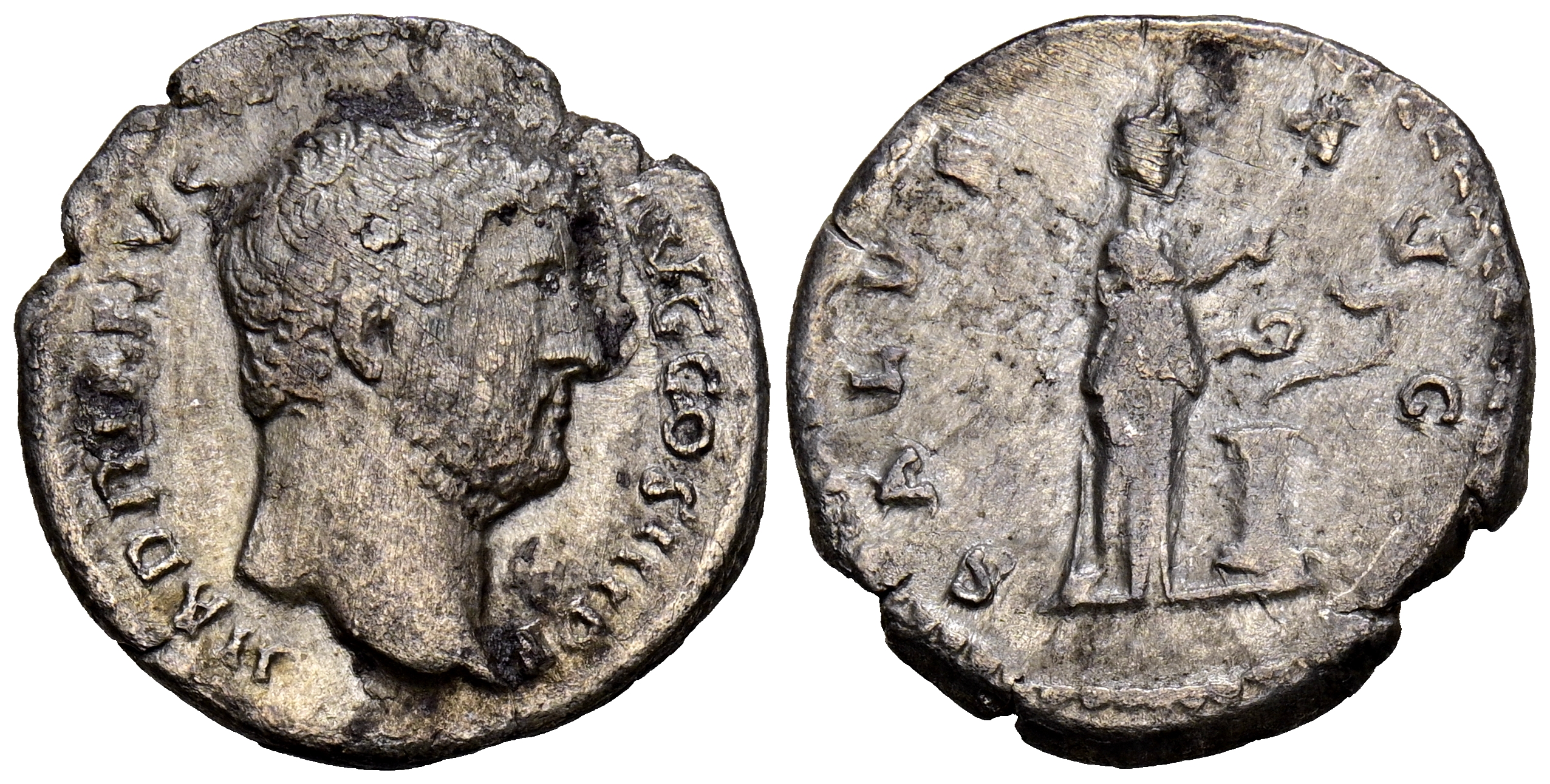 ADRIANO. Denario. (Ar. 2,85g/18mm). 134-138 d.C. Roma. (RIC 267). Anv: Cabeza de Adriano a derecha, alrededor leyenda: HADRIANVS AVG COS III P P. Rev: Salus estante a derecha alimentando a serpiente en columna de patera, alrededor leyenda: SALVS AVG. MBC. Concreción en reverso.
