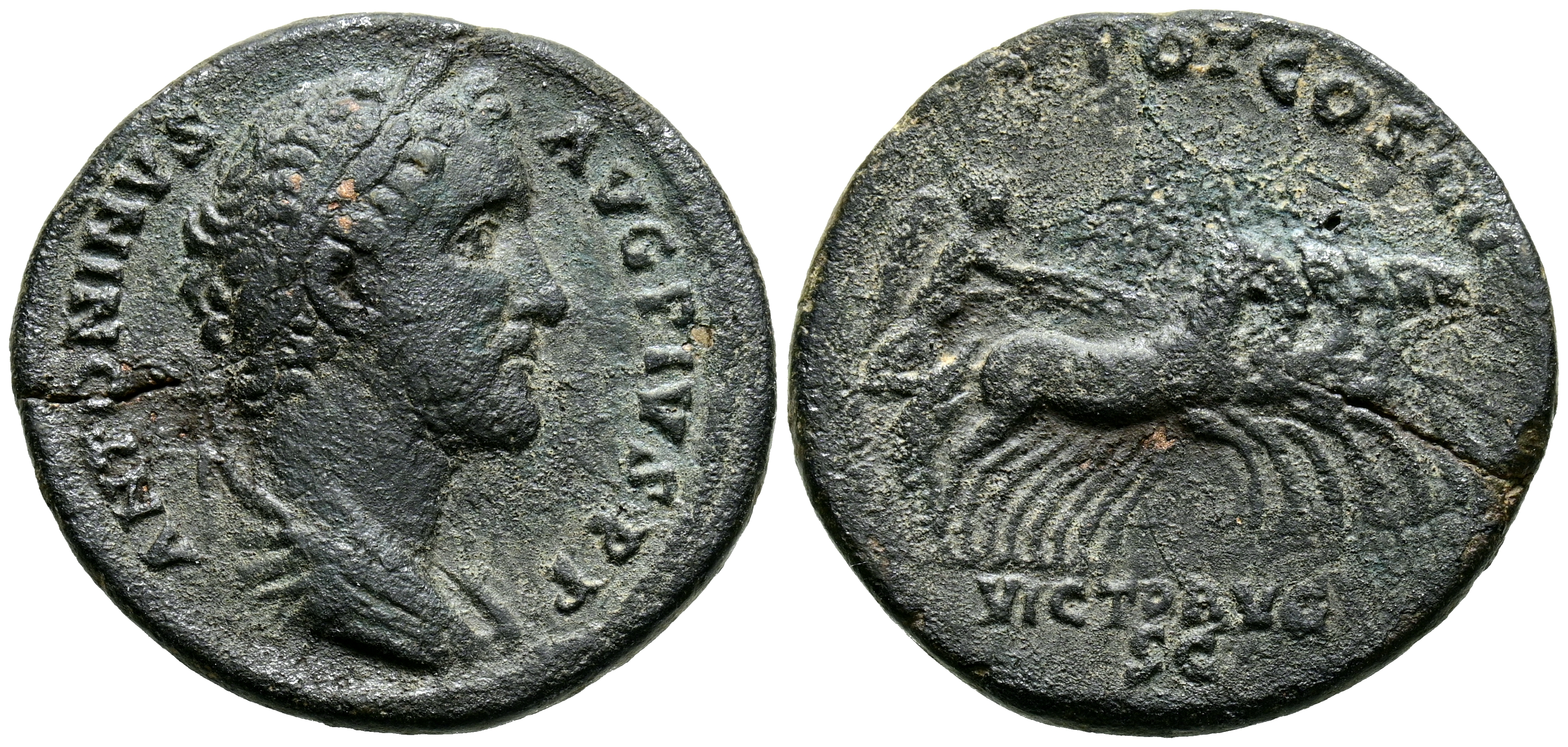 ANTONINO PIO. As. (Ae. 8,65g/26mm). 145-161 d.C. Roma. (RIC 836). Anv: Busto laureado y drapeado de Antonino Pío a la derecha, alrededor leyenda: ANTONINVS AVG PIVS P P P. Rev: Victoria en viga conduciendo cuadriga a derecha, en exergo: VICT AVG / SC, alrededor leyenda: TR POT COS IIII. MBC. Grieta de acuñación.
