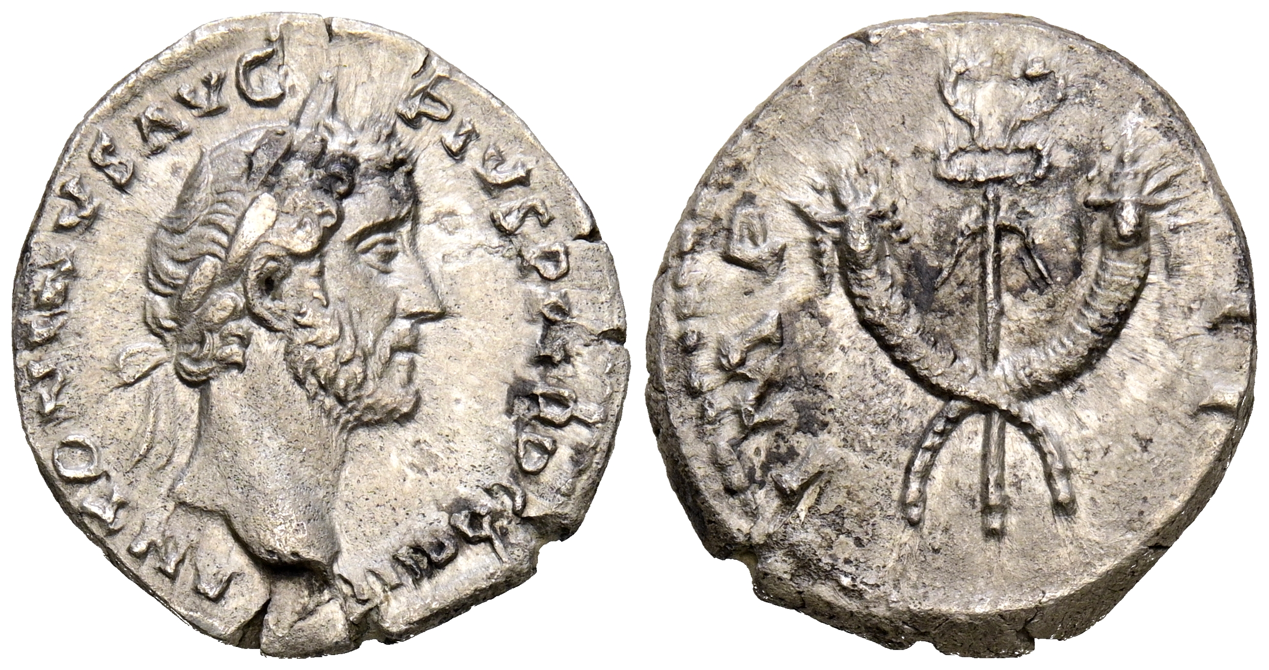 ANTONINO PIO. Denario. (Ar. 3,58g/18mm). 143-144 d.C. Roma. (RIC 107b). Anv: Cabeza laureada de Antonino Pío a derecha, alrededor leyenda: ANTONINVS AVG PIVS P P TR P COS II. Rev: Caduceo entre dos cornucopias entrelazadas, alrededor leyenda: IMP II. MBC+.