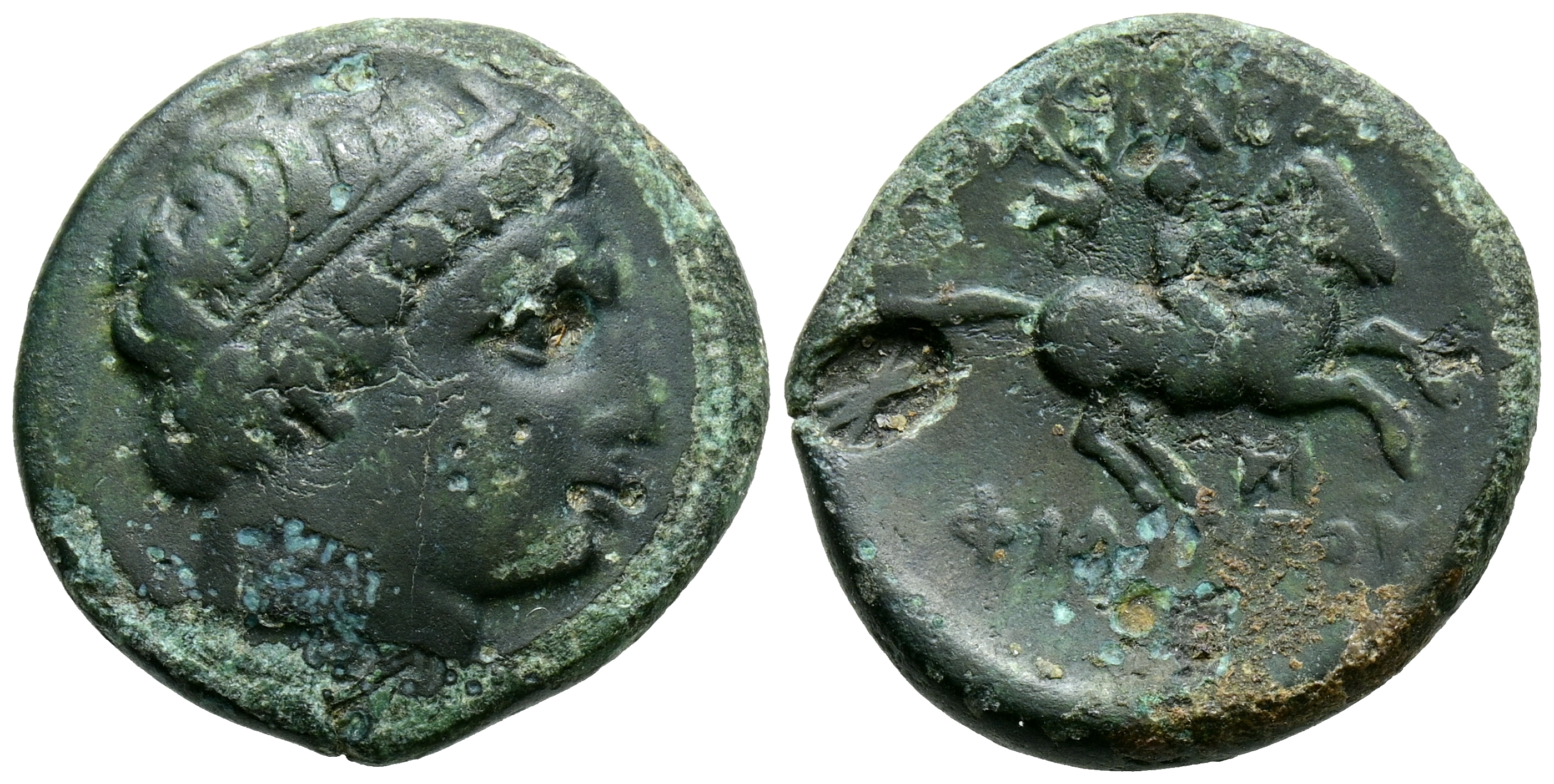 REYES DE MACEDONIA, Filipo III Arrhidaios. Ae15. (Ae. 4,33g/16mm). 323-317 a.C. Ceca incierta del oeste de Asia. (Price 2803). Anv: Cabeza de Heracles con piel de león a derecha dentro de escudo macedonio. Rev: Casco macedonio, a la izquierda monograma griego, a la derecha caduceo. MBC.
