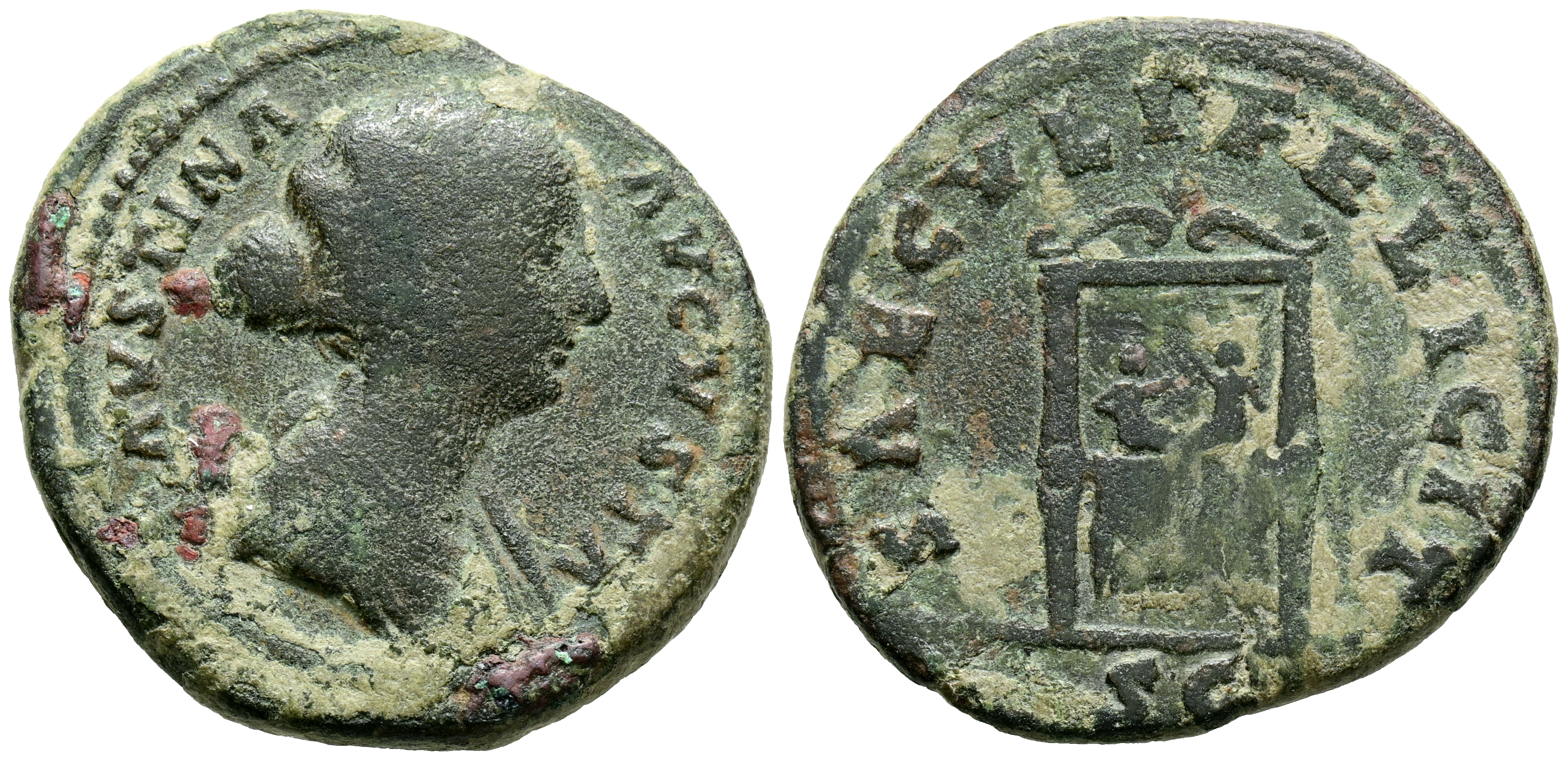 FAUSTINA II. As. (Ae. 11.12g/28mm). 161-164 d.C. Roma. (RIC 1666). Anv: Busto drapeado de Faustina II a derecha, alrededor leyenda: FAVSTINA AVGVSTA. Rev: Cómodo y Antonino de niños sobre pulvinar, en exergo: S-C, alrededor leyenda: SAECVLI FELICIT. MBC