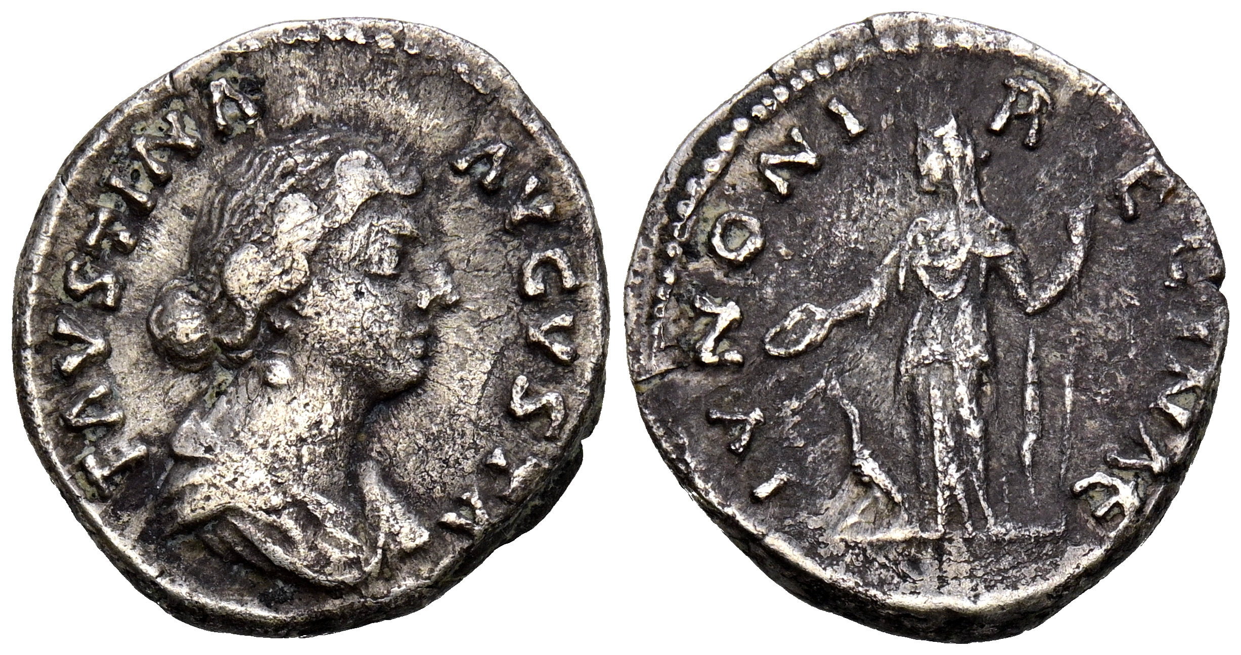 FAUSTINA II. Denario. (Ar. 3,27g/18mm). 164-165 d.C. Roma. (RIC 694). Anv: Busto drapeado de Faustina II a derecha, alrededor leyenda: FAVSTINA AVGVSTA. Rev: Juno estante a izquierda portando patera y cetro, a sus pies, pavo real, alrededor leyenda: IVNONI REGINAE. MBC+.
