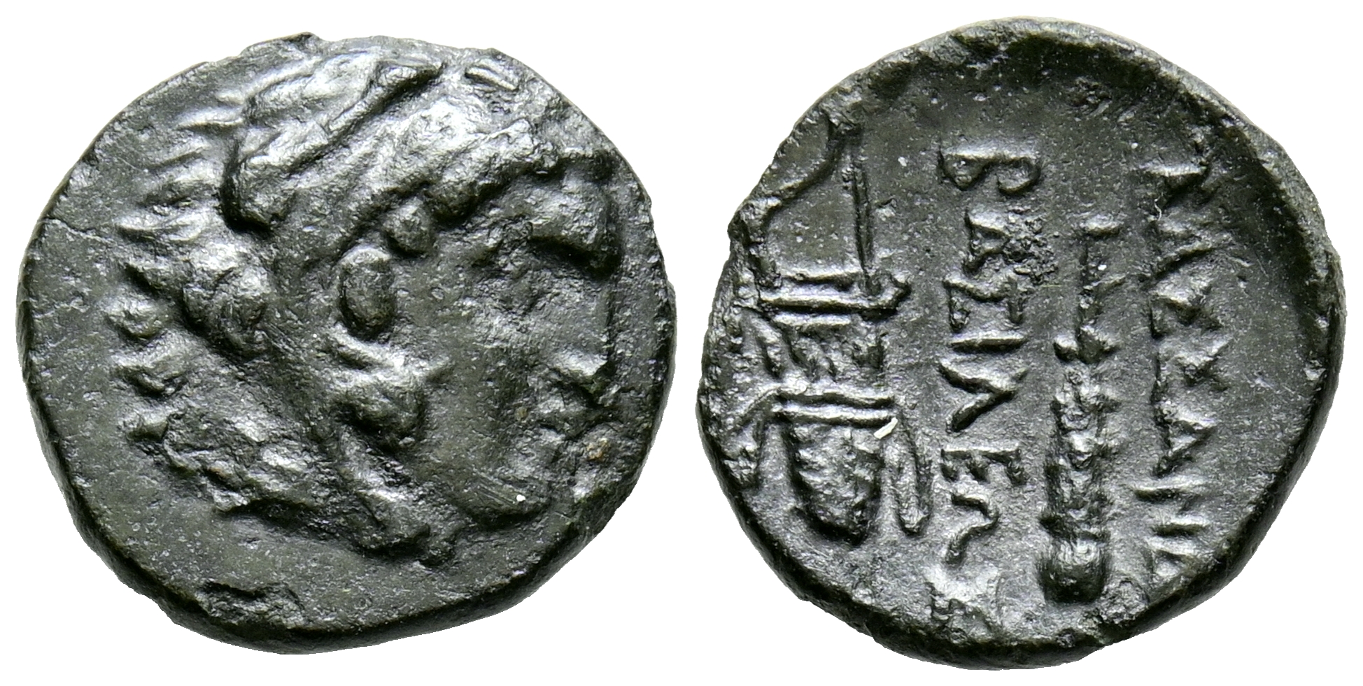 REYES DE MACEDONIA, Casandro. Ae14. (Ae. 1,33g/14mm). 316-297 a.C. Ceca incierta. (AMNG III). Anv: Cabeza de Hércules con piel de león a derecha. Rev: Mazo y arco con carcaj, entre ellos leyenda: ΒΑΣΙΛΕΩΣ / ΚΑΣΣΑΝΔΡΟΥ. MBC+.