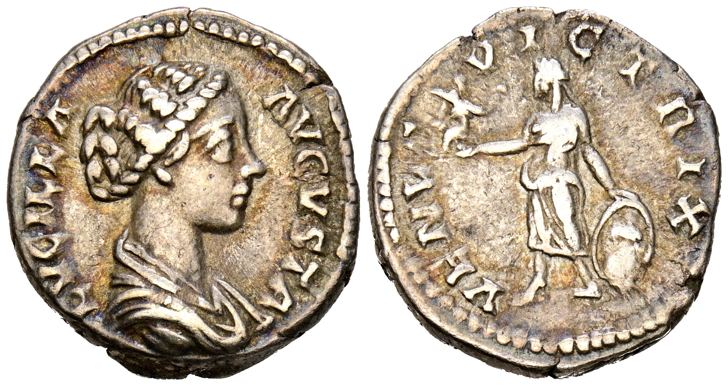 LUCILLA. Denario. (Ar. 2,86g/19mm). 164-169 d.C. Roma. (RIC 786). Anv: Busto diademado y drapeado de Lucilla a derecha, alrededor leyenda: LVCILLA AVGVSTA. Rev: Venus estante a izquierda portando Victoria y escudo, alrededor leyenda: VENVS VICTRIX. MBC+. Atractivo ejemplar.