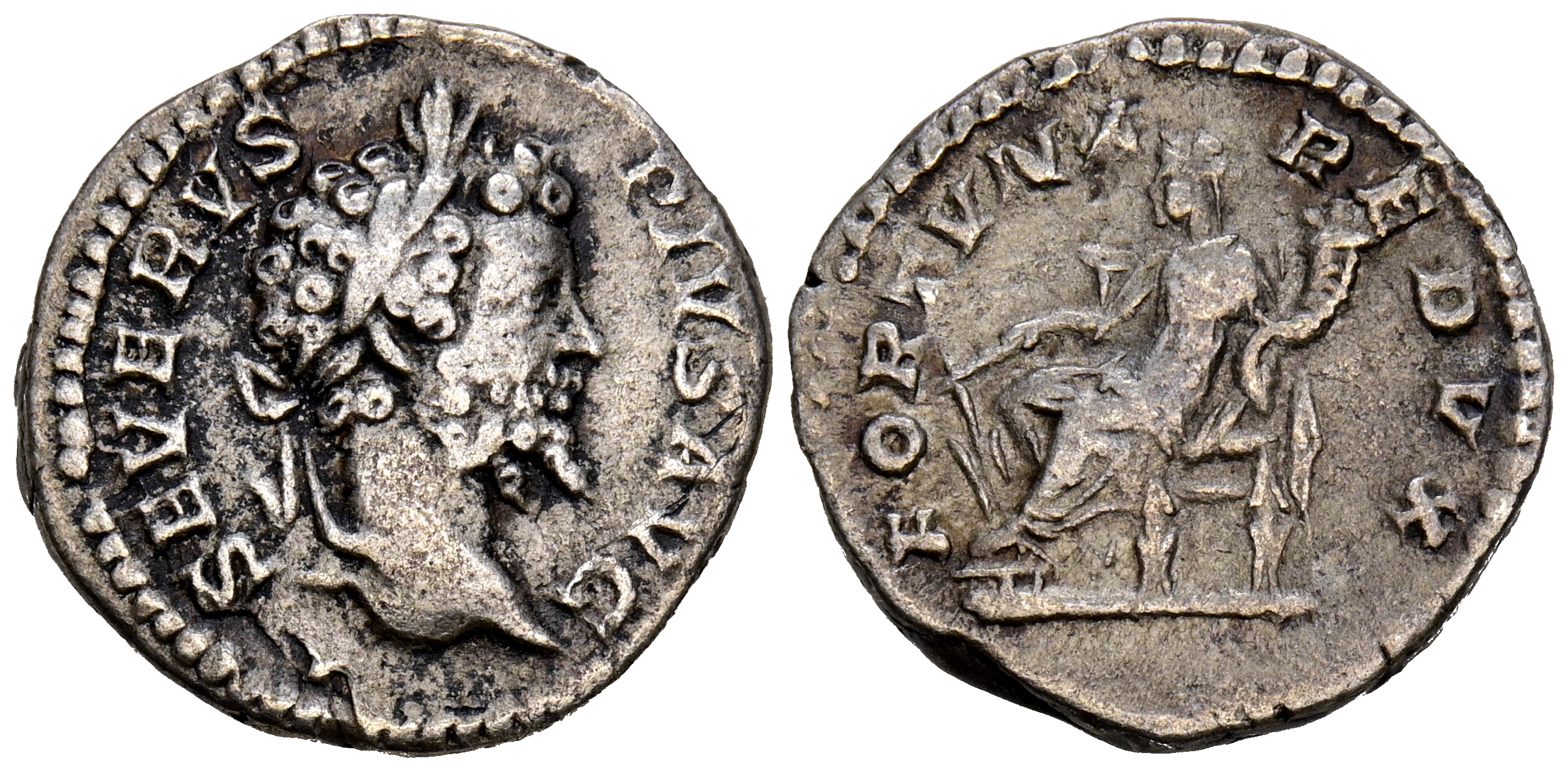 SEPTIMIO SEVERO. Denario. (Ar. 3,22g/18mm). 203 d.C. Roma. (RIC 264a). Anv: Cabeza laureada de Septimio Severo a derecha, alrededor leyenda: SEVERVS PIVS AVG. Rev: Fortuna sentada a izquierda portando cornucopia y timón, debajo rueda, alrededor leyenda: FORTVNA REDVX. MBC.