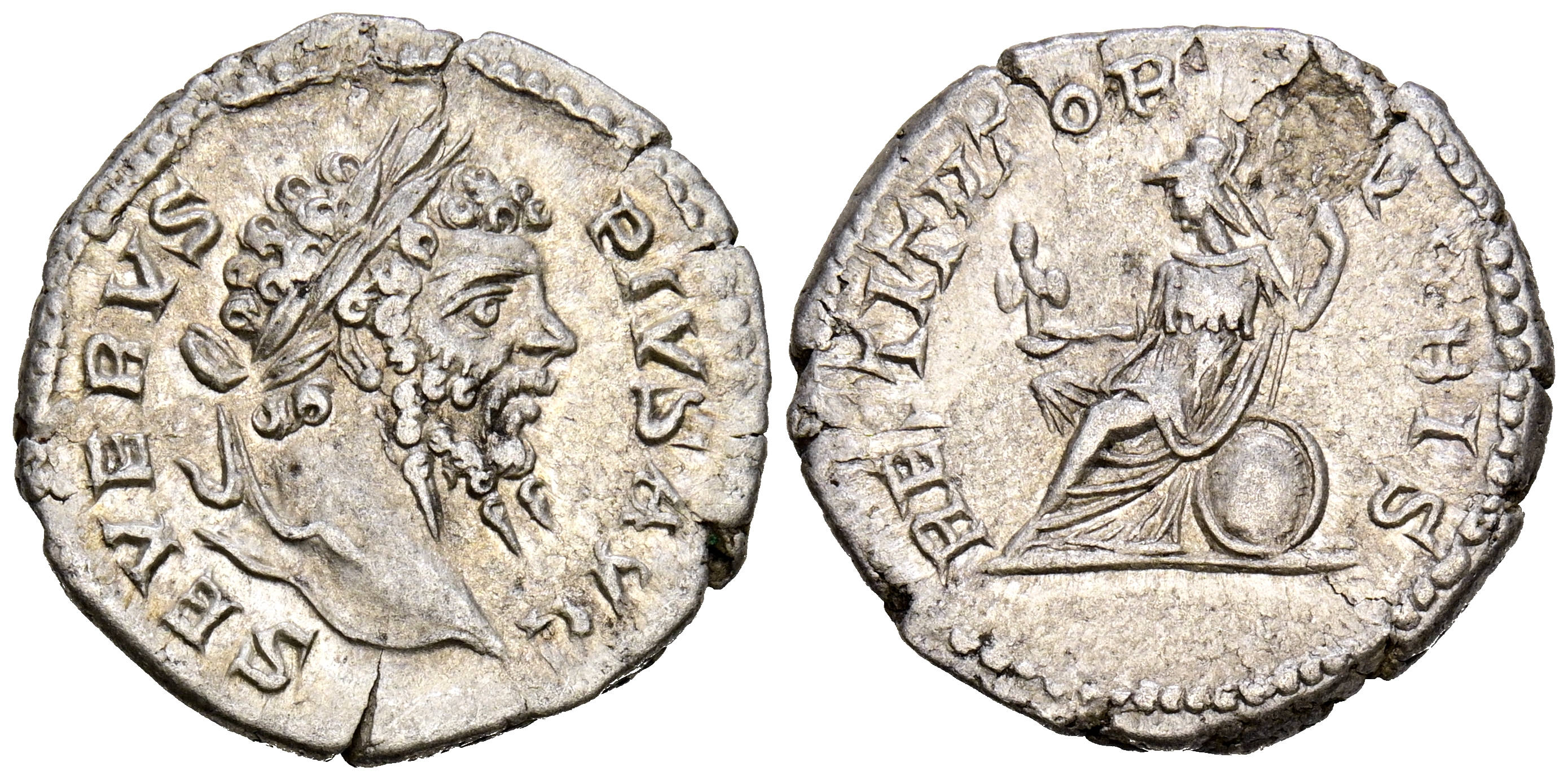 SEPTIMIO SEVERO. Denario. (Ar. 3,26g/19mm). 202-210 d.C. Roma. (RIC 288). Anv: Caebza laureada de Septimio Severo a derecha, alrededor leyenda: SEVERVS PIVS AVG. Rev: Roma sentada sobre escudo a izquierda portando Victoria sobre globo y lanza, alrededor leyenda: RESTITVTOR VRBIS. MBC+/MBC. Hoja fuerte en reverso.
