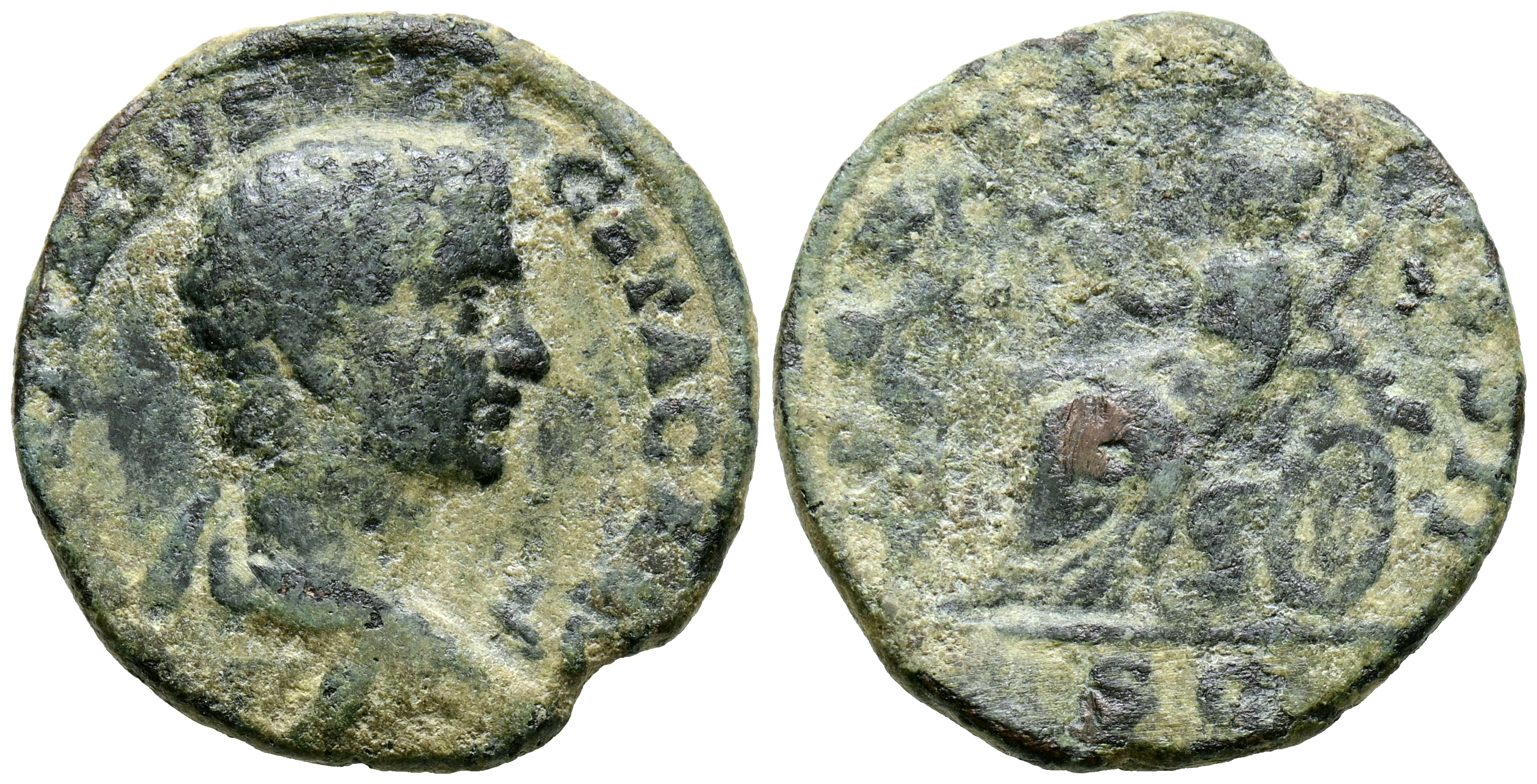 GETA. As. (Ae. 5,71g/24mm). 208 d.C. Roma. (RIC 148). Anv: Busto laureado y drapeado de Geta a derecha, alrededor leyenda: P SEPTIMIVS GETA CAES. Rev: Minerva sentada a la izquierda, alimentando a la serpiente enredada en olivo, detrás búho sobre escudo, en exergo: SC, alrededor leyenda: PONTIF COS II. BC+.