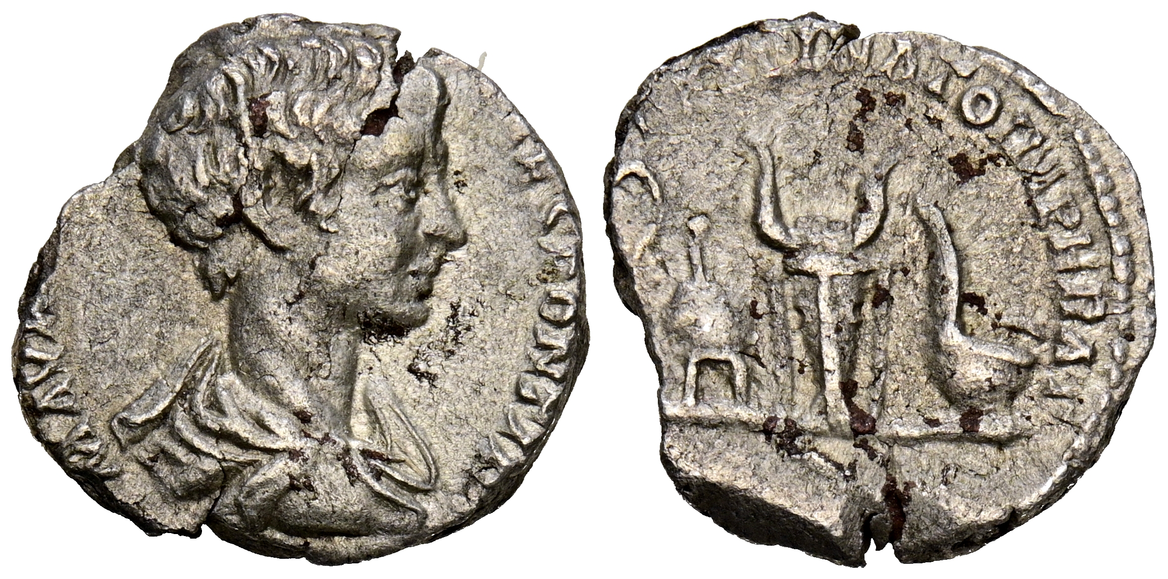 CARACALLA. Denario. (Ar. 1,99g/16mm). 196-198 d.C. Roma. (RIC 6). Rev: Busto drapeado de Caracalla a la derecha, alrededor de la leyenda: M AVR ANTON CAES PONTIF. Rev: Elementos sacerdotales, alrededor leyenda: DESTINATO IMPERAT. MBC-. Cospel irregular.