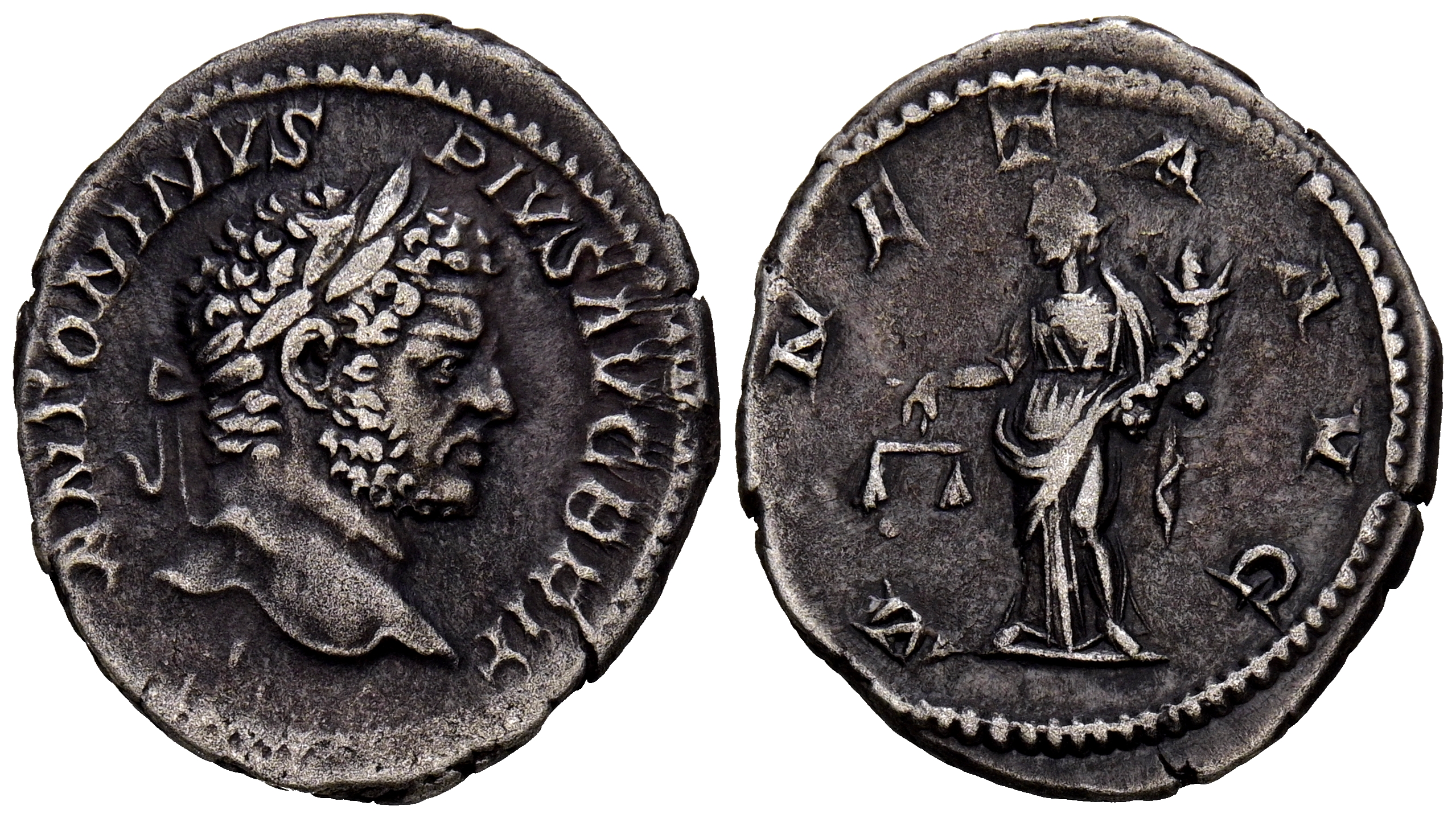 CARACALLA. Denario. (Ar. 2,92g/20mm). 210-213 d.C. Roma. (RIC 224). Anv: Cabeza laureada de Caracalla a derecha, alrededor leyenda: ANTONINVS PIVS AVG BRIT. Rev: Moneta estante a izquierda portando escalas y cornucopia, alrededor leyenda: MONETA AVG. MBC+.
