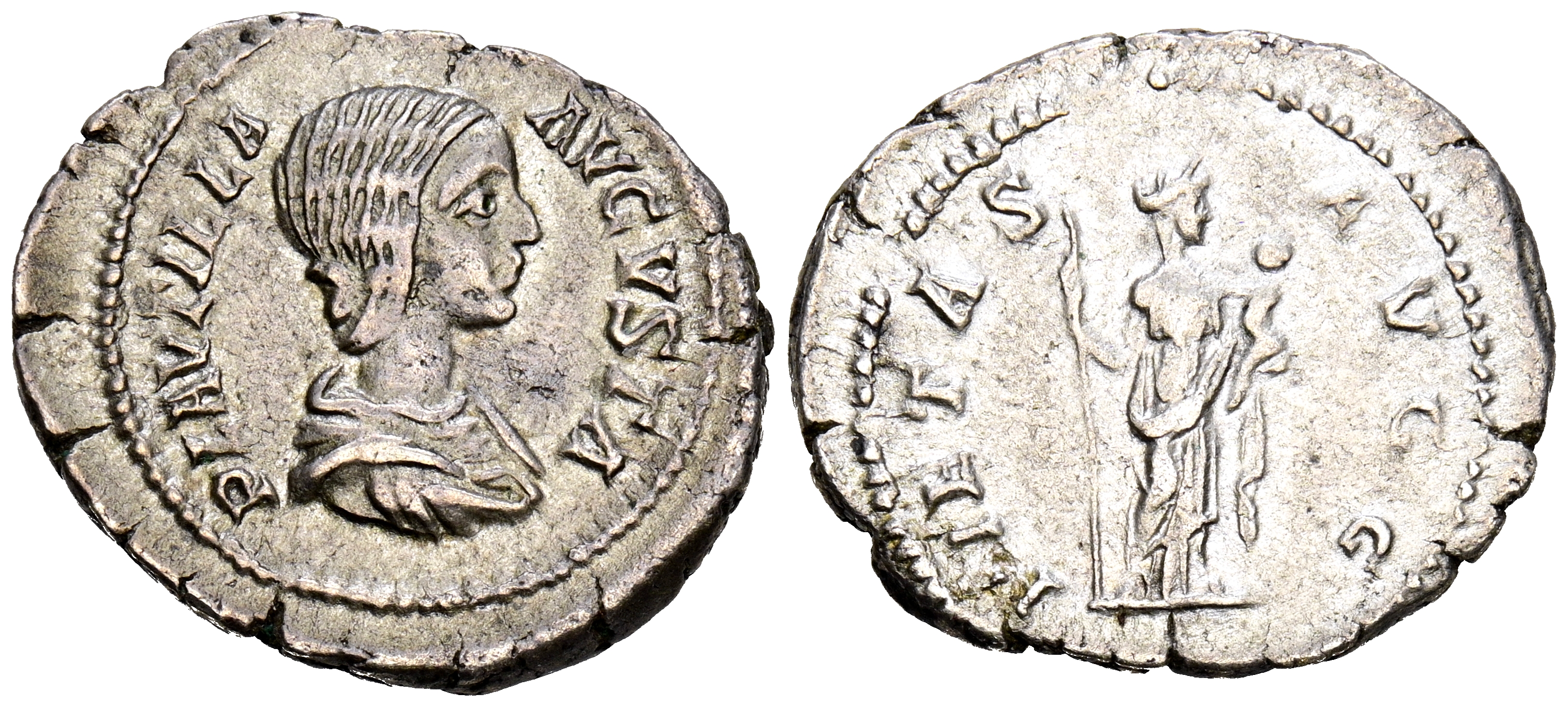 PLAUTILLA. Denario. (Ar. 3,40g/21mm). 203 d.C. Roma. (RIC 367). Anv: Busto drapeado de Plautilla a derecha, alrededor leyenda: PLAVTILLA AVGVSTA. Rev: Pietas estante a derecha portando cetro y niño en sus brazos, alrededor leyenda: PIETAS AVGG. MBC+.