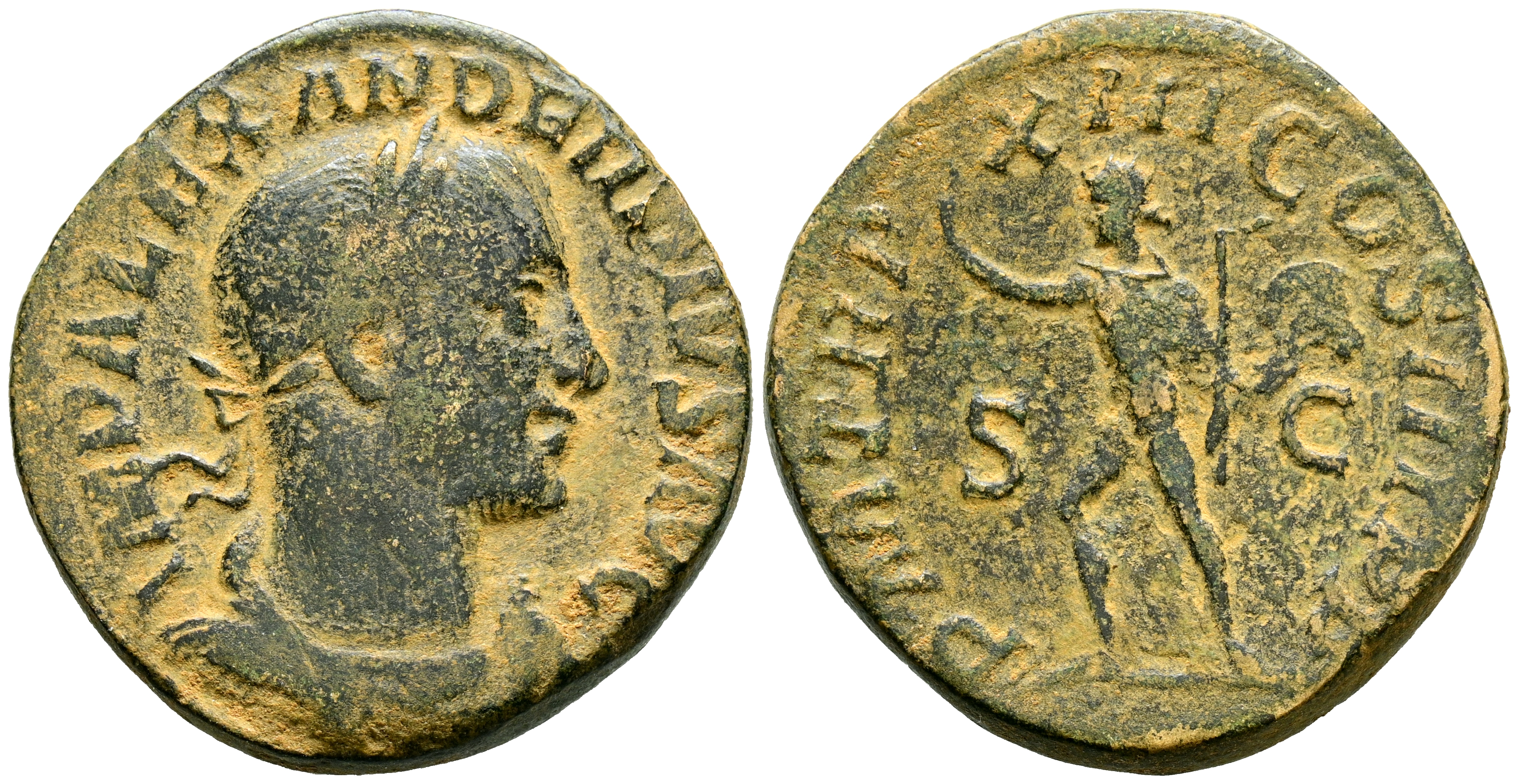 ALEJANDRO SEVERO. Sestercio. (Ae. 19,07g/29mm). 233 d.C. Roma. (RIC 541). Anv: Busto laureado y con coraza de Alejandro Severo a derecha, alrededor leyenda: IMP ALEXANDER PIVS AVG. Rev: Sol avanzando a izquierda portando látigo y alzando mano derecha, entre S-C, alrededor leyenda: P M TR P XIIII COS III P P. MBC-.