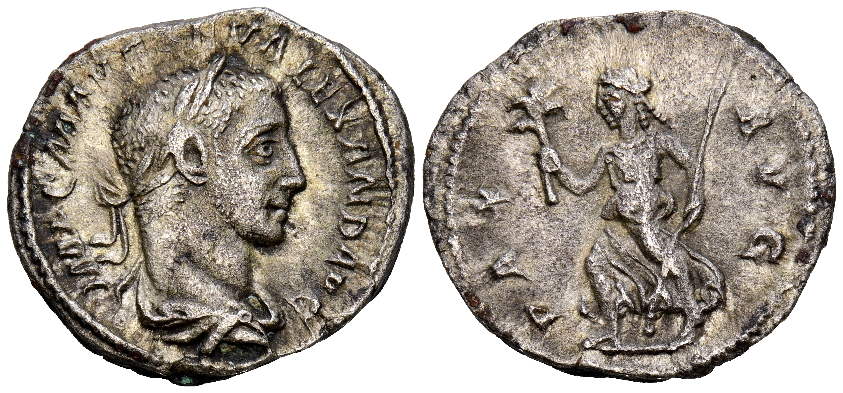 ALEJANDRO SEVERO. Denario. (Ar. 2,46g/20mm). 226 D.C. Roma. (RIC 168). Anv: Busto laureado y drapeado a derecha de Alejandro Severo, alrededor leyenda: IMP C M AVR SEV ALEXAND AVG. Rev: Pax avanzando a izquierda portando rama y cetro, alrededor leyenda: PAX AVG. MBC+/MBC.