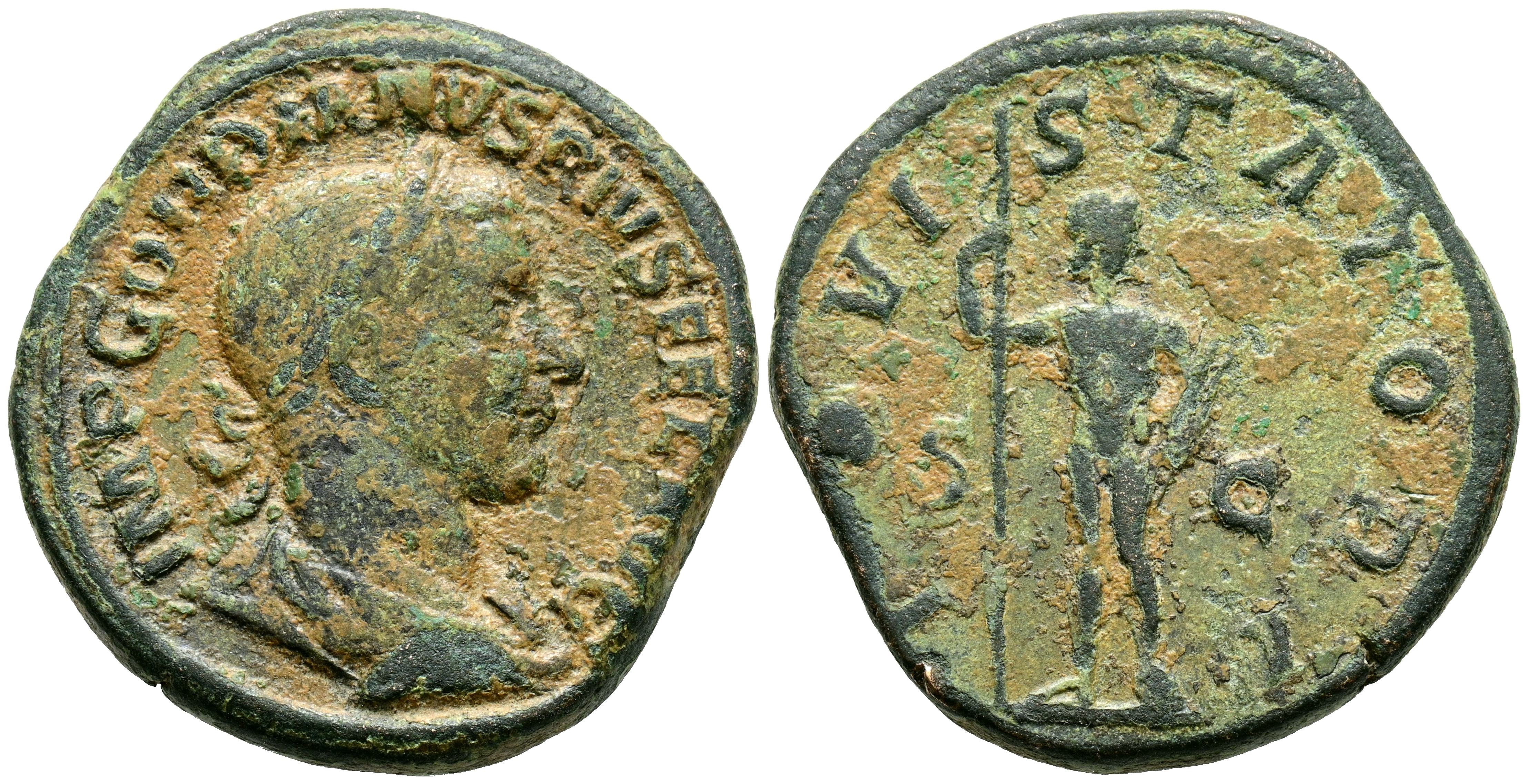 GORDIANO III. Sestercio. (Ae. 21,22g/31mm). 241-244 d.C. Roma. (RIC 298a). Anv: Busto laureado, drapeado y acorazado de Gordiano III a la derecha, alrededor leyenda: IMP GORDIANVS PIVS FEL AVG. Rev: Júpiter desnudo y estante de frente con cabeza a la derecha, portando cetro, entre: S-C, alrededor leyenda: IOVI STATORI. MBC.